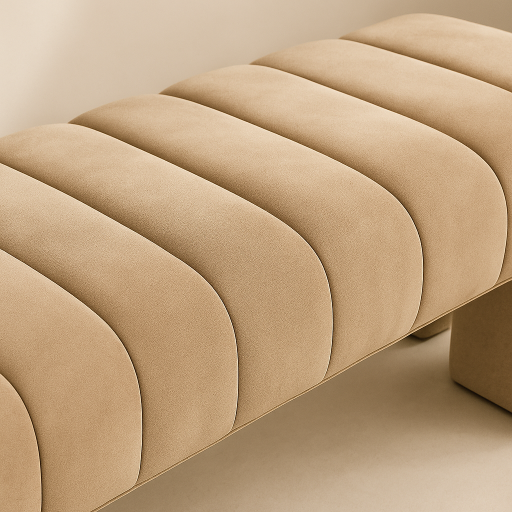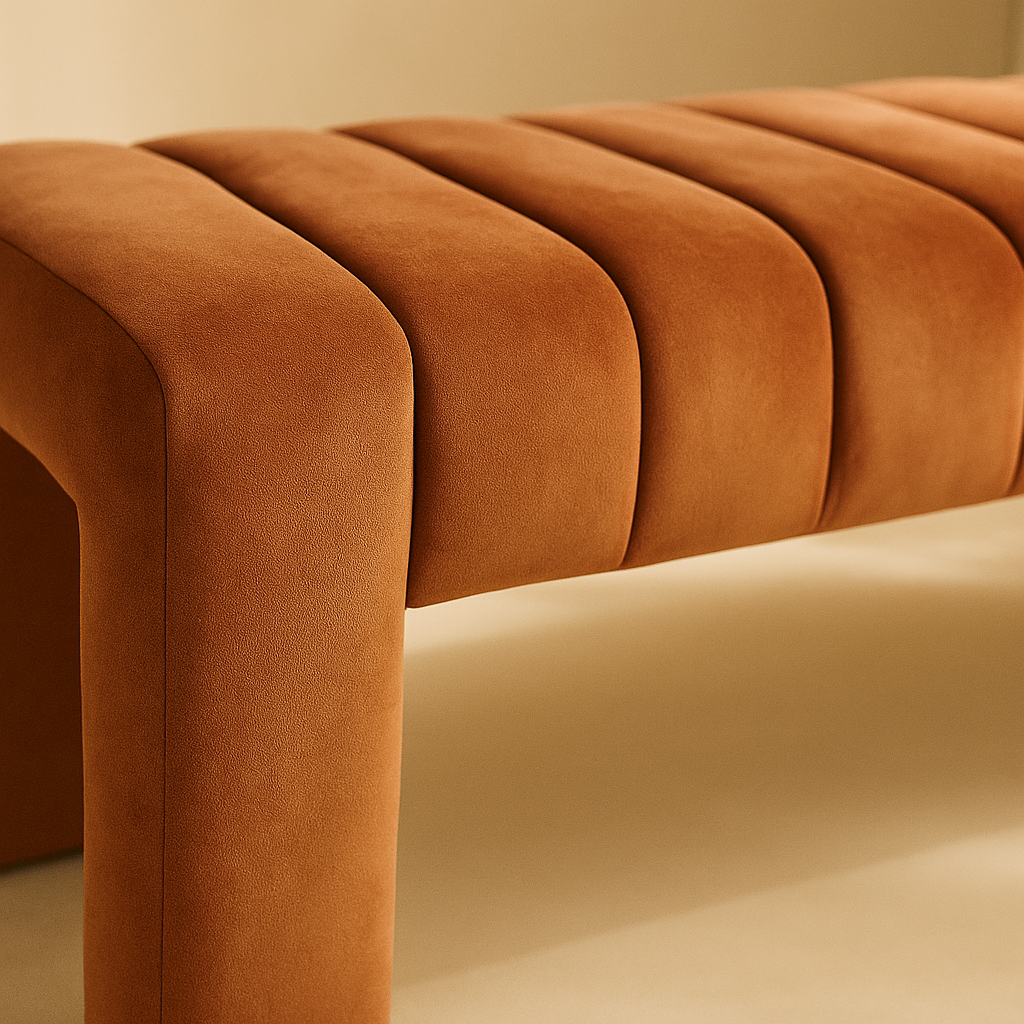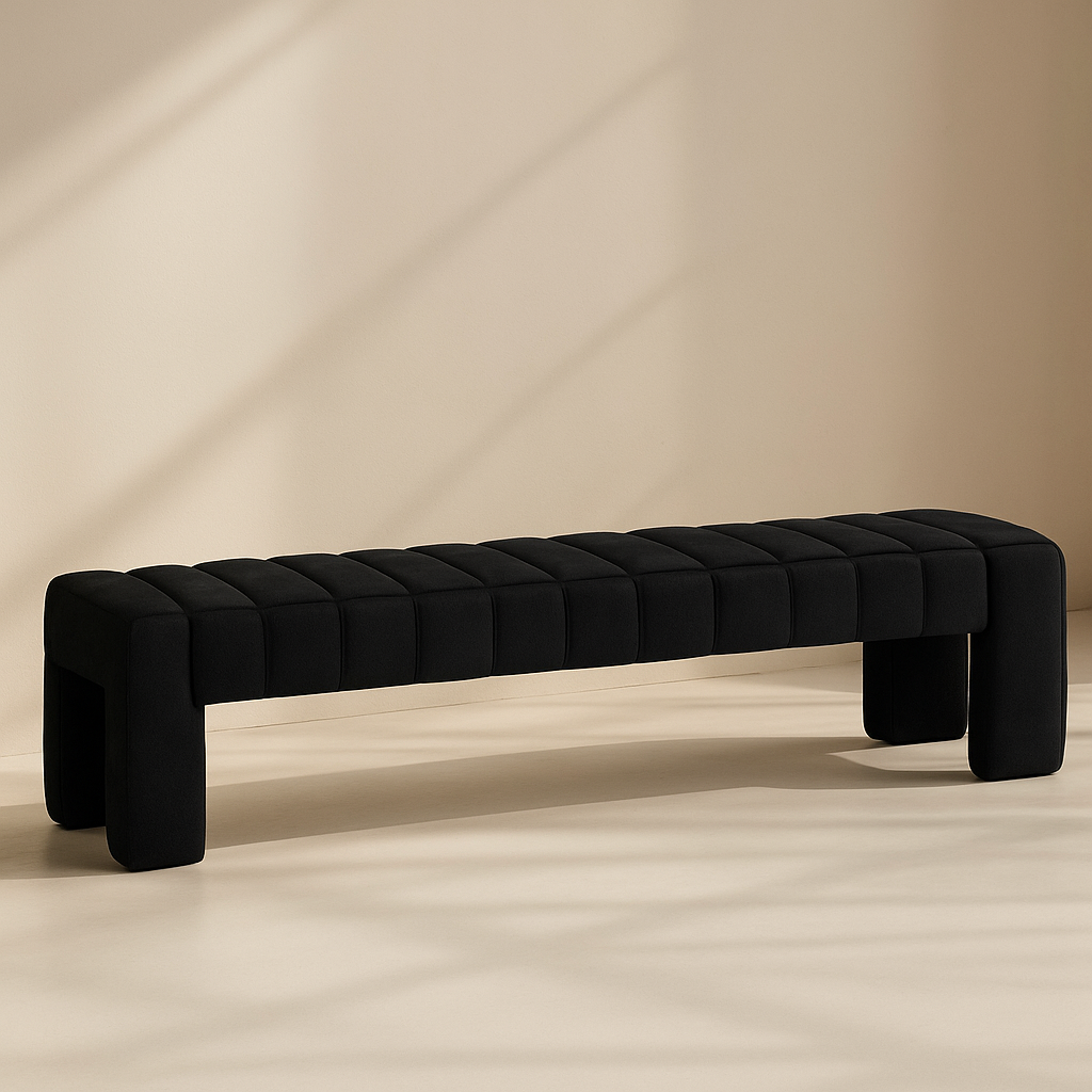 The Andaz Velvet Bench brings modern elegance and luxurious comfort to any space. Upholstered in rich saddle velvet, it features distinctive deep channel tufting that adds texture and refinement to its sleek profile. The plush, generously padded seat rests on a strong solid wood frame that ensures long-lasting durability and support. Its clean, minimal lines offer versatility, making it perfect for bedrooms, living rooms, or entryways. With its contemporary silhouette and upscale materials, the Andaz Bench is designed to impress. Available in black, cream, green, cognac, brown, camel, and saddle. Dimensions: 60.5" W x 17.5" D x 17.5" H.