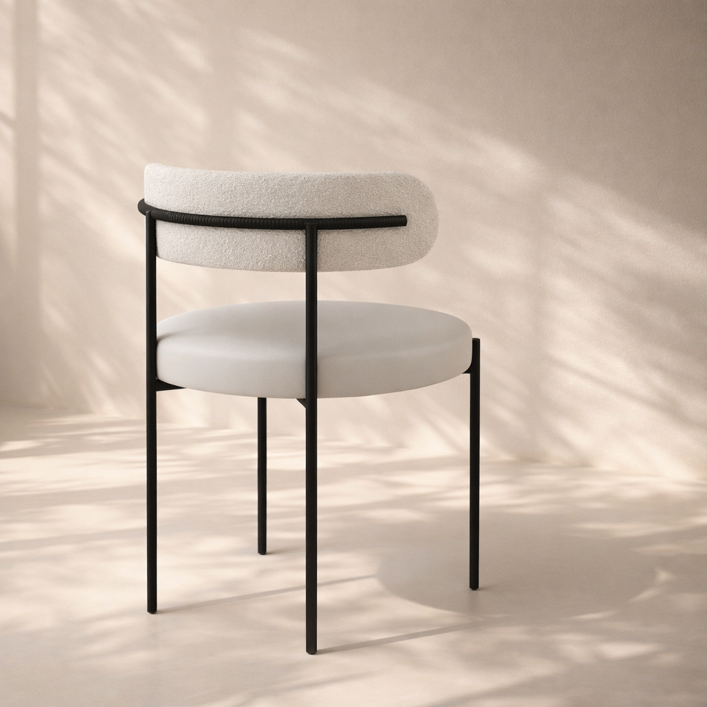 The Beacon Vegan Leather and Boucle Fabric Dining Chair brings warmth and texture to the table with its sculptural silhouette and tactile upholstery. Wrapped in a richly textured boucle fabric and vegan leather seat, the plush seat and gently curved backrest provide inviting comfort while maintaining a clean, contemporary profile. Slim, matte metal legs ground the design with a modern edge, creating a striking contrast to the softness of the upholstery. Available in black, gray, cream, olive, and green to complement a variety of interiors. Dimensions: 22" W x 21" D x 30" H.
