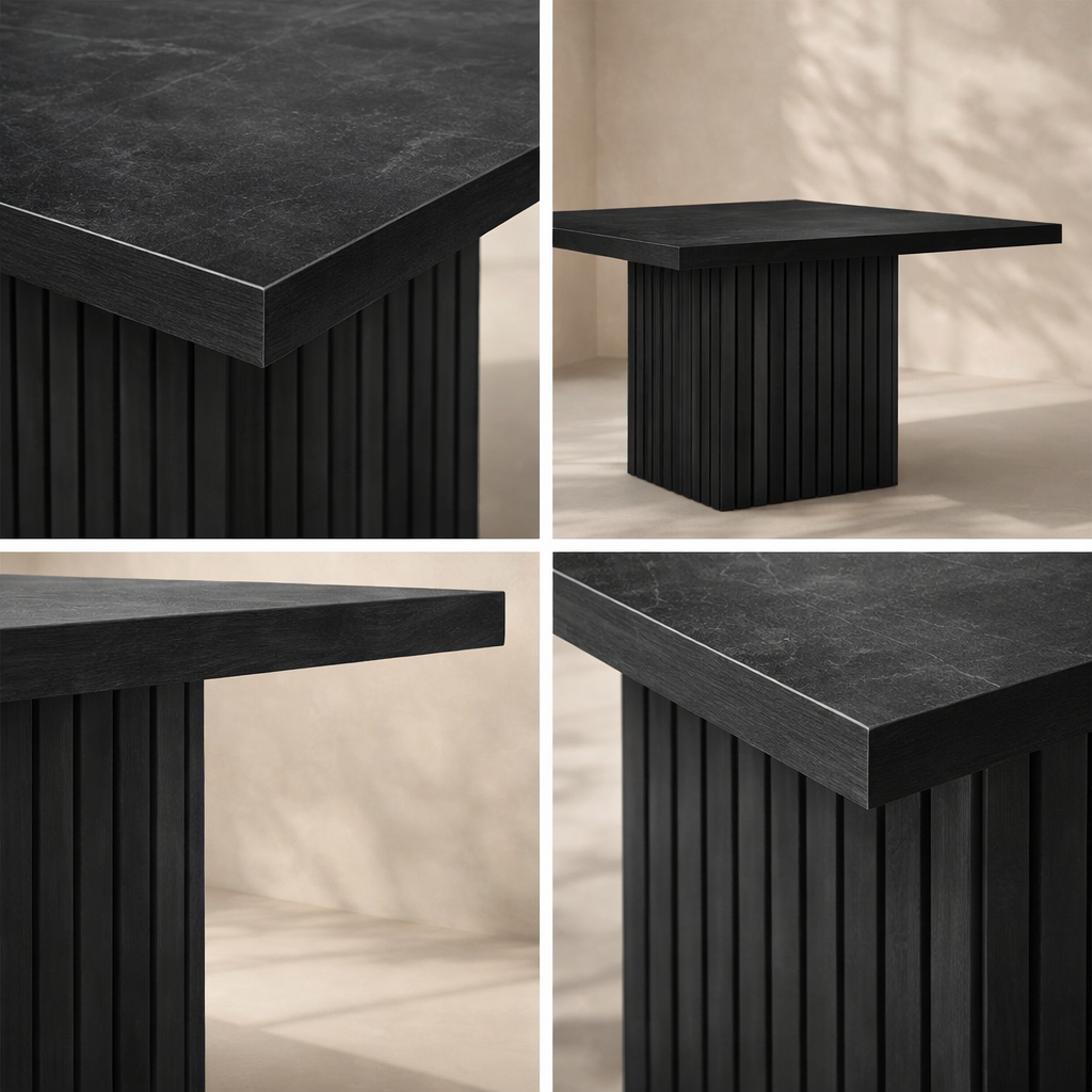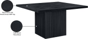 The Belinda 54" Dining Table brings modern elegance and practical function to your dining room or eat-in kitchen. Crafted with a solid wood base and topped with a black finish oak veneer over MDF, its bold square silhouette and fluted pedestal create a statement-making focal point. Designed for comfort and durability, the sturdy build invites relaxed meals with family or guests. The natural wood grain variation ensures each table is truly unique, offering subtle depth and character to any dining space. Available in black, brown, and natural to suit a variety of décor themes. Dimensions: 54" W x 54" D x 31" H.