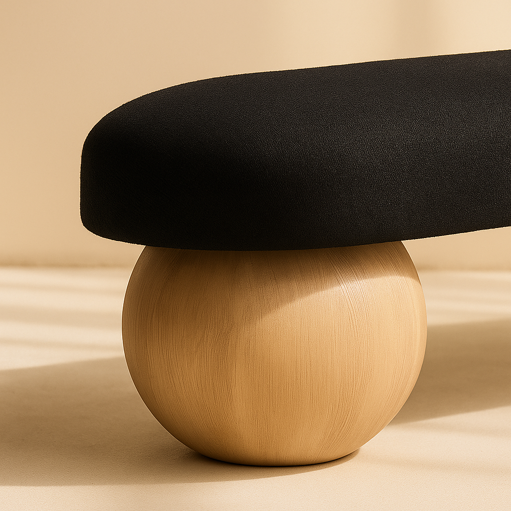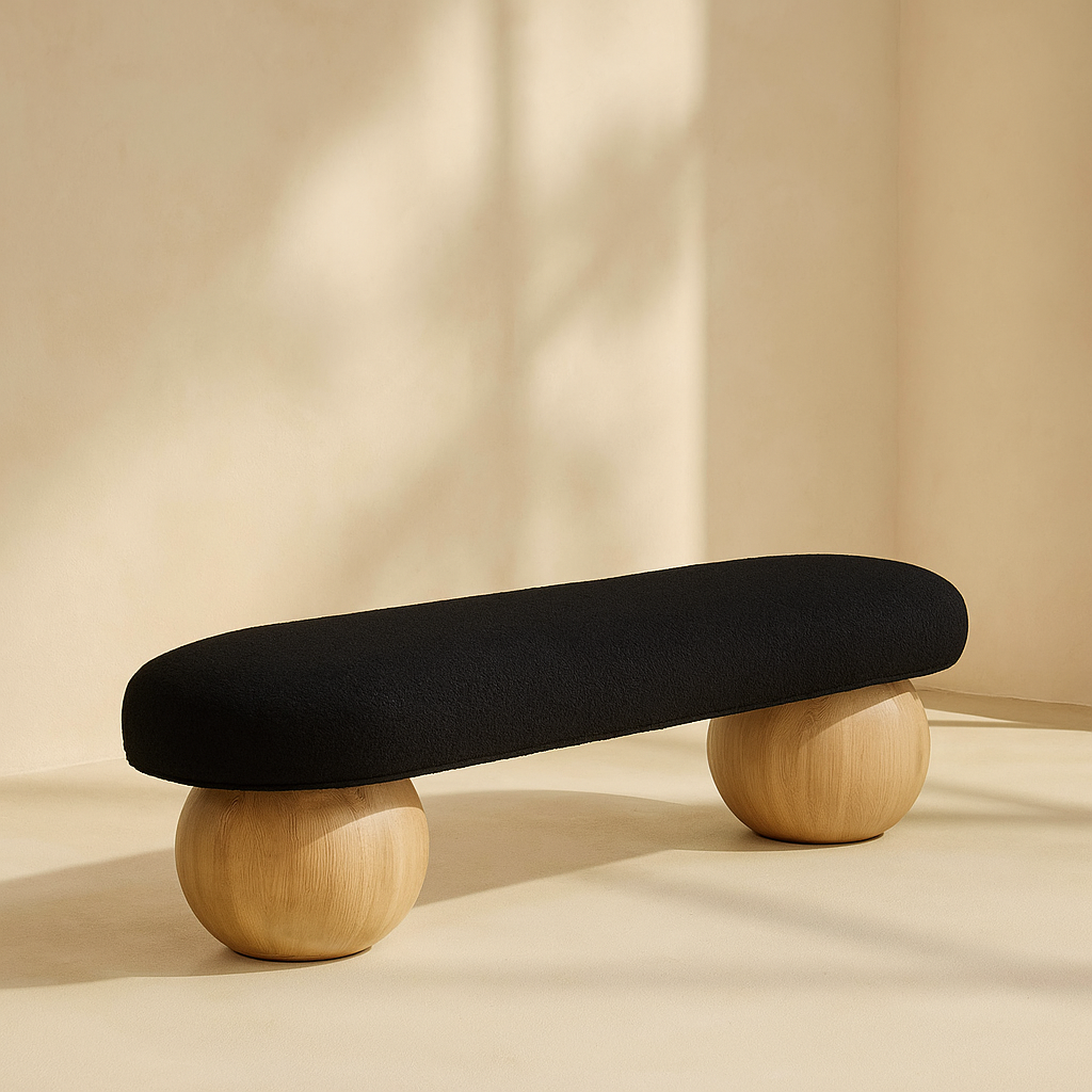 The Bowie Boucle Fabric Bench brings modern sophistication to any room with its striking design. Upholstered in luxurious boucle fabric, this bench offers a rich black tone that immediately draws attention, adding a refined touch to your living space or bedroom. Its distinctive ball-shaped legs are crafted from solid ash wood with a black finish, giving it an artful, sculptural presence that feels both contemporary and timeless. The plush seating invites comfort while serving as a bold decorative statement. Available in black, cream, and olive, the Bowie Bench allows for versatile styling options. Dimensions: 59.5"W x 18"D x 17"H.Â