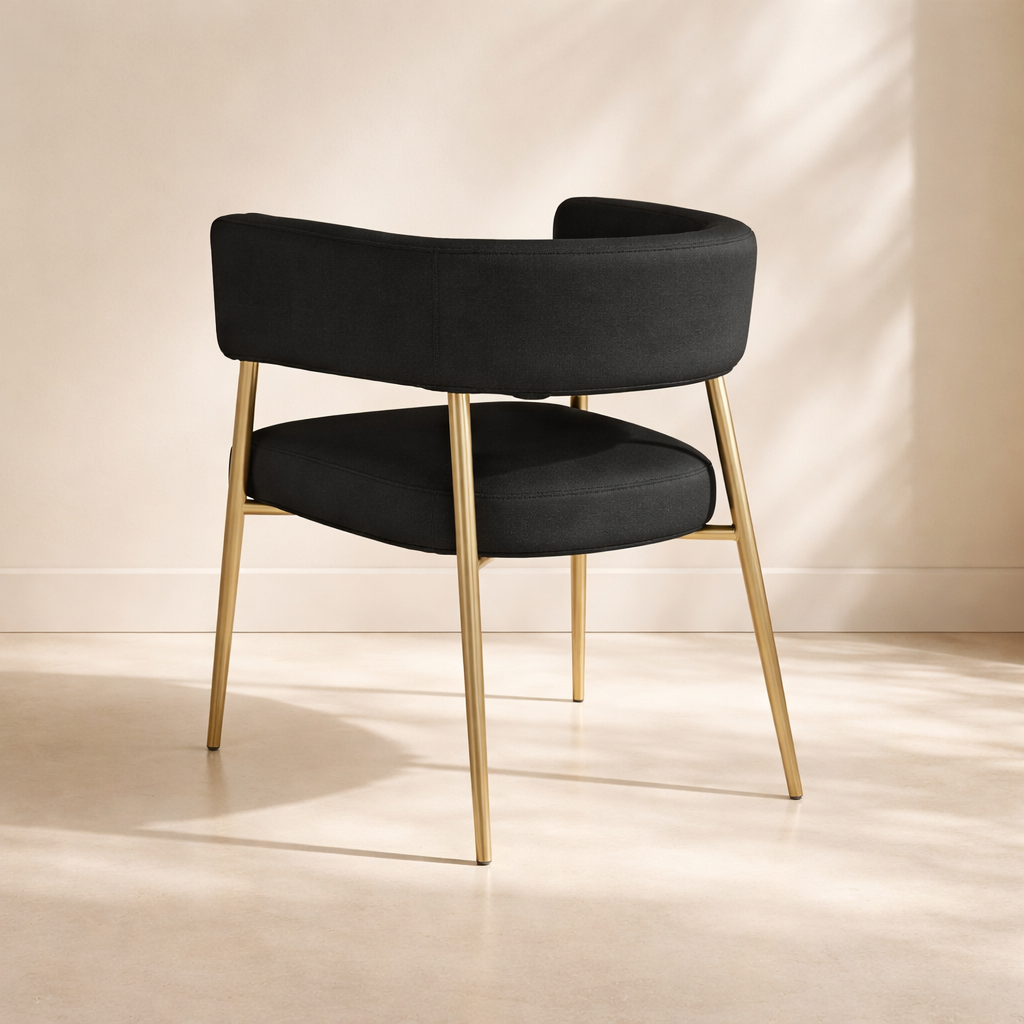 The Creston Linen Fabric Dining Chair brings modern sophistication to your dining room with its durable linen-textured upholstery and graceful silhouette. Upholstered in rich black fabric, this chair features a curved back and cushioned seat that deliver comfort for everyday meals or festive gatherings. The slim, brushed gold metal legs provide a striking contrast while ensuring long-lasting stability. Its sculptural frame offers both ergonomic support and elegant style, making it a perfect fit for contemporary interiors. Available in black, gray, cream, and blue to match a variety of décors. Dimensions: 24" W x 21.5" D x 29.5" H.