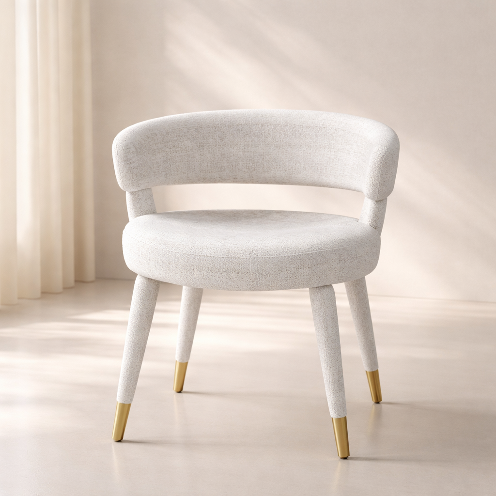 The Destiny Boucle Fabric Dining Chair brings modern comfort and textured elegance to your dining space. Upholstered in rich cream boucle fabric, this chair blends cozy softness with a sleek silhouette, making it an inviting option for meals and gatherings. The rounded backrest curves gently around the seat, offering supportive comfort and a stylish profile that complements both contemporary and minimalist interiors. Gold-tipped legs add a hint of glam, anchoring the chair with refined detail and durability. Whether paired with a statement dining table or used as an accent chair, it delivers both functionality and style. Available in a soft cream finish to effortlessly match a range of palettes. Dimensions: 23"W x 23"D x 31.5"H