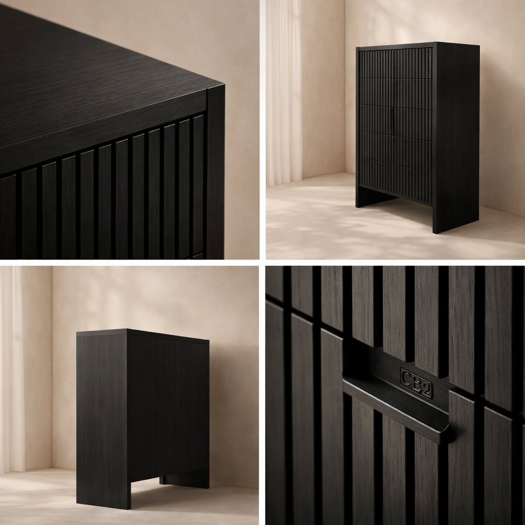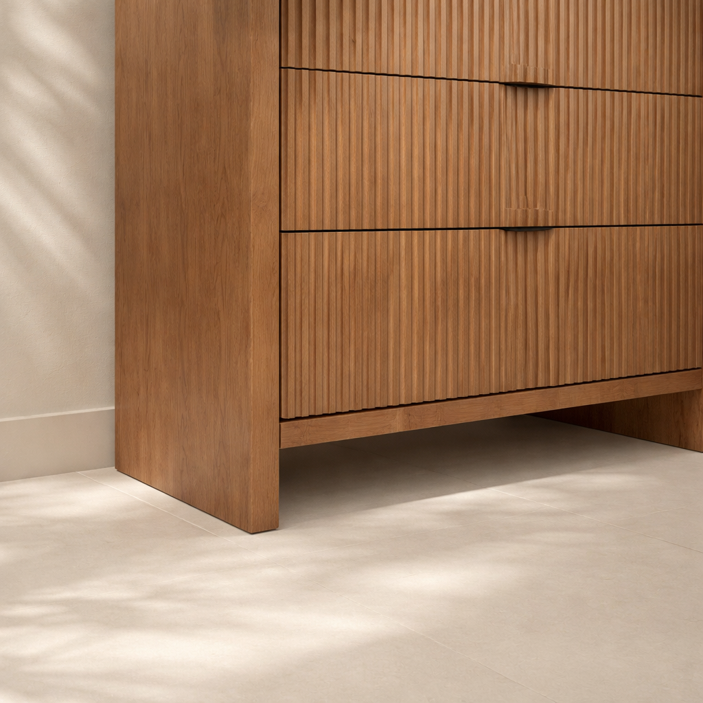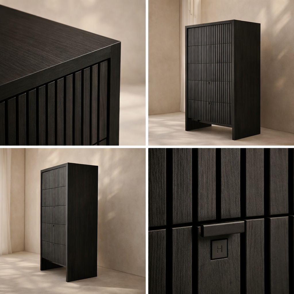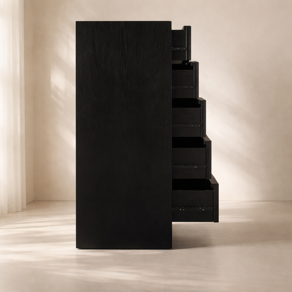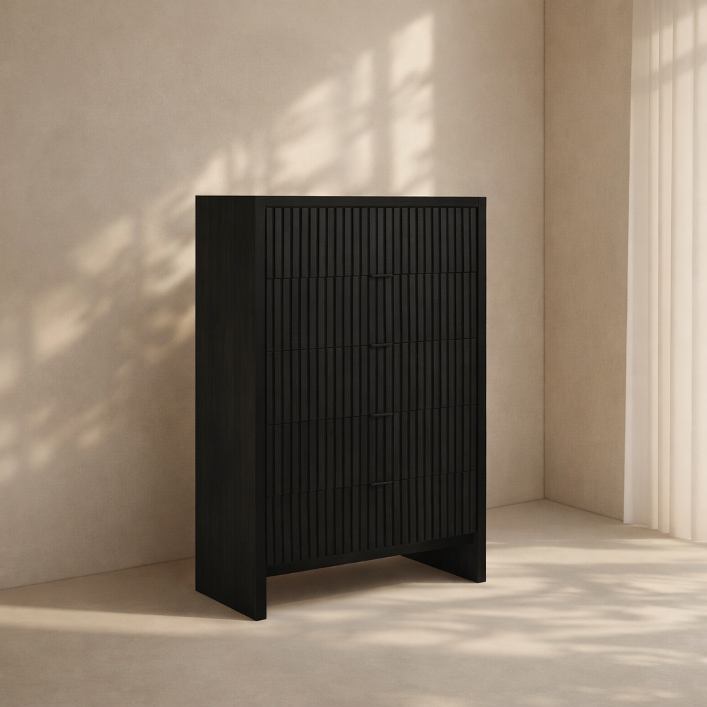 The Fairfax Chest brings modern sophistication to any bedroom with its clean-lined profile and textured drawer design. Crafted from solid wood and oak veneer, its fluted front panels create a striking vertical rhythm that adds architectural interest. Matte black metal handles enhance the piece with a contemporary edge while ensuring easy functionality. Designed with five spacious drawers, it offers ample storage for clothing, accessories, or linens, keeping everything organized yet out of sight. The sturdy build and rich finish make it both a practical and decorative piece in your space. Available in black, cream, brown, and natural finishes to suit a variety of interior styles. Dimensions: 32" W x 20" D x 50" H.