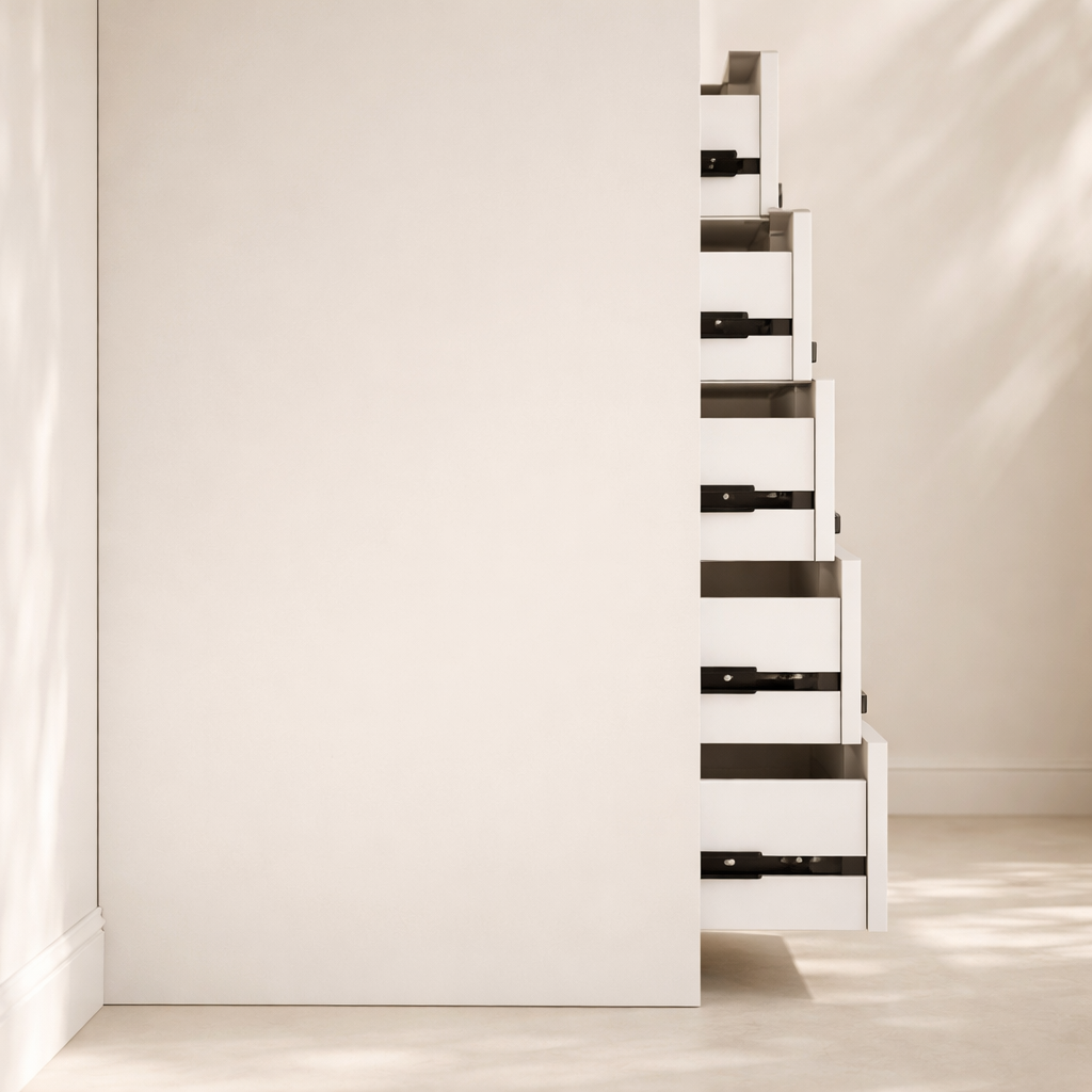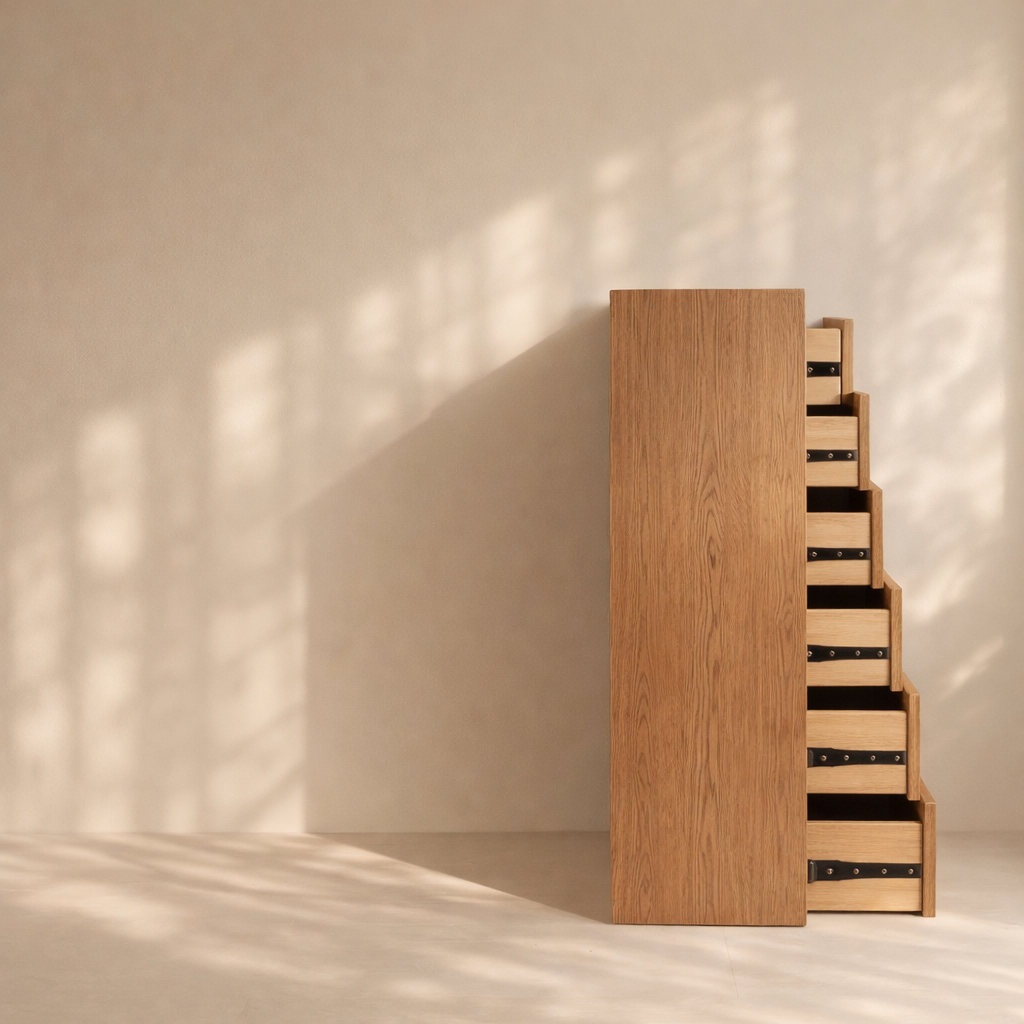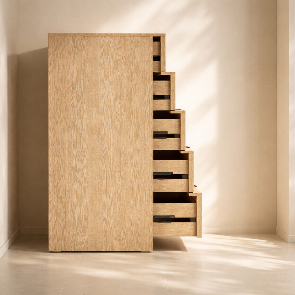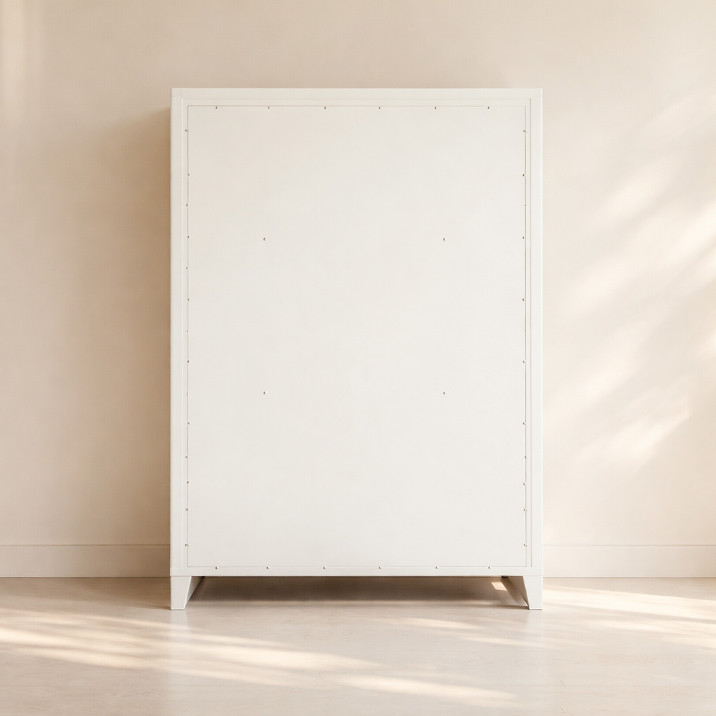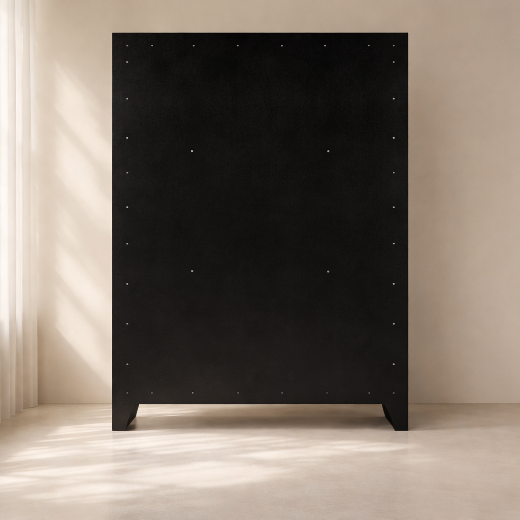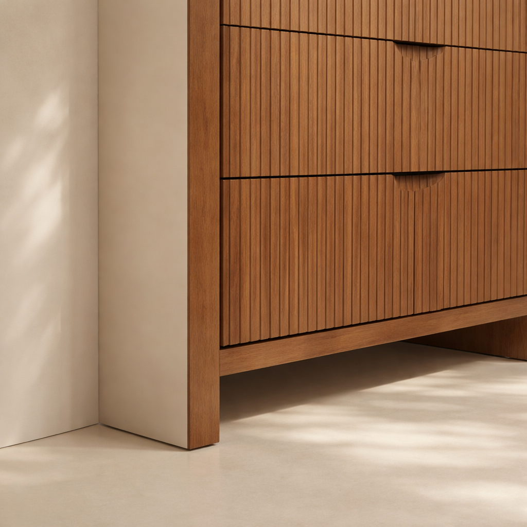 The Fairfax Chest brings modern sophistication to any bedroom with its clean-lined profile and textured drawer design. Crafted from solid wood and oak veneer, its fluted front panels create a striking vertical rhythm that adds architectural interest. Matte black metal handles enhance the piece with a contemporary edge while ensuring easy functionality. Designed with five spacious drawers, it offers ample storage for clothing, accessories, or linens, keeping everything organized yet out of sight. The sturdy build and rich finish make it both a practical and decorative piece in your space. Available in black, cream, brown, and natural finishes to suit a variety of interior styles. Dimensions: 32" W x 20" D x 50" H.