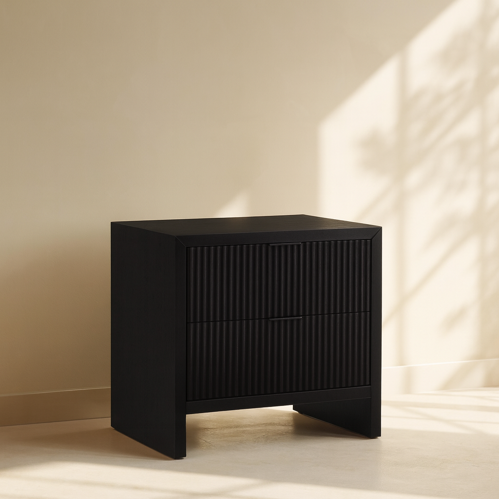 The Fairfax Nightstand brings modern elegance and timeless craftsmanship into your bedroom with its solid wood and oak veneer construction. Fluted drawer fronts create a beautiful texture, while the matte black handles add contrast and easy grip. Its natural wood grain finish offers a warm, organic look that blends effortlessly with various decor styles. The arched base design adds a subtle sculptural element, enhancing its clean lines. Built for durability and daily use, it provides functional storage with two spacious drawers. Available in black, cream, natural, and brown, this piece fits seamlessly into both minimal and richly layered interiors. Dimensions: 26"W x 18"D x 26"H.
