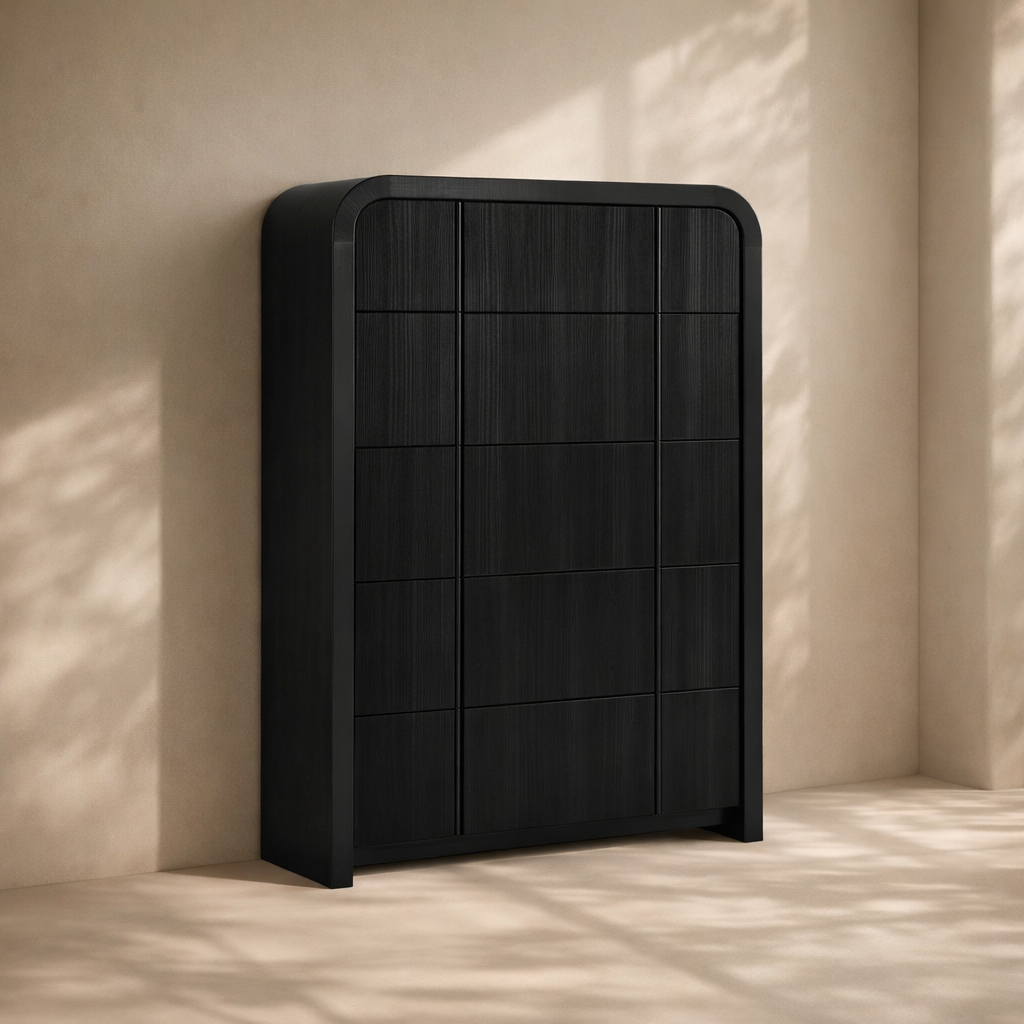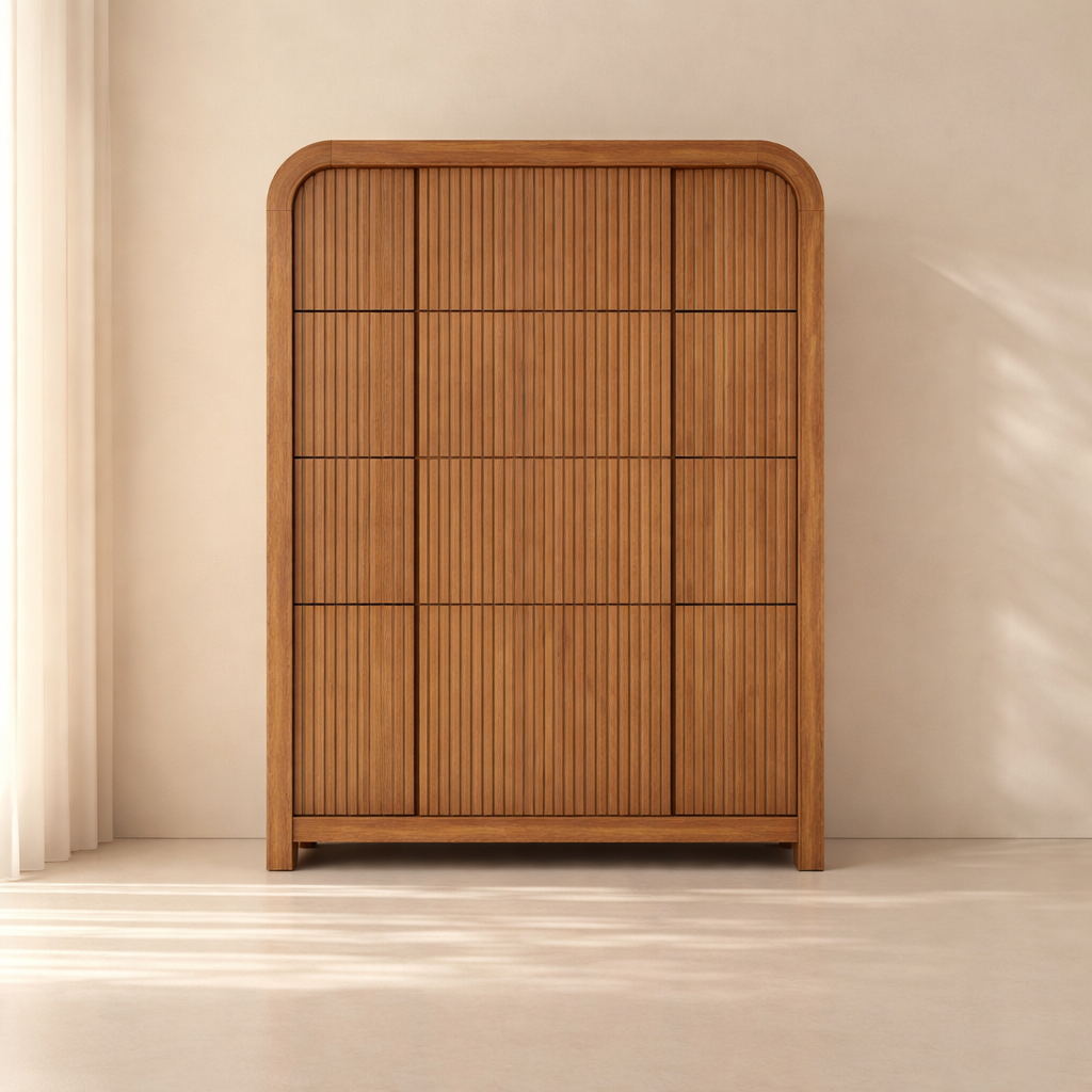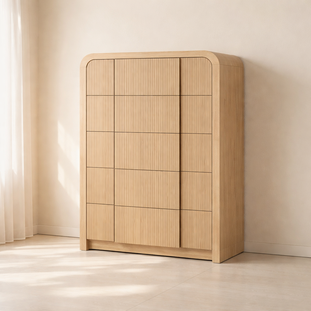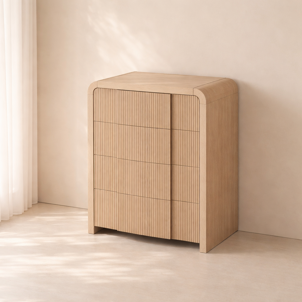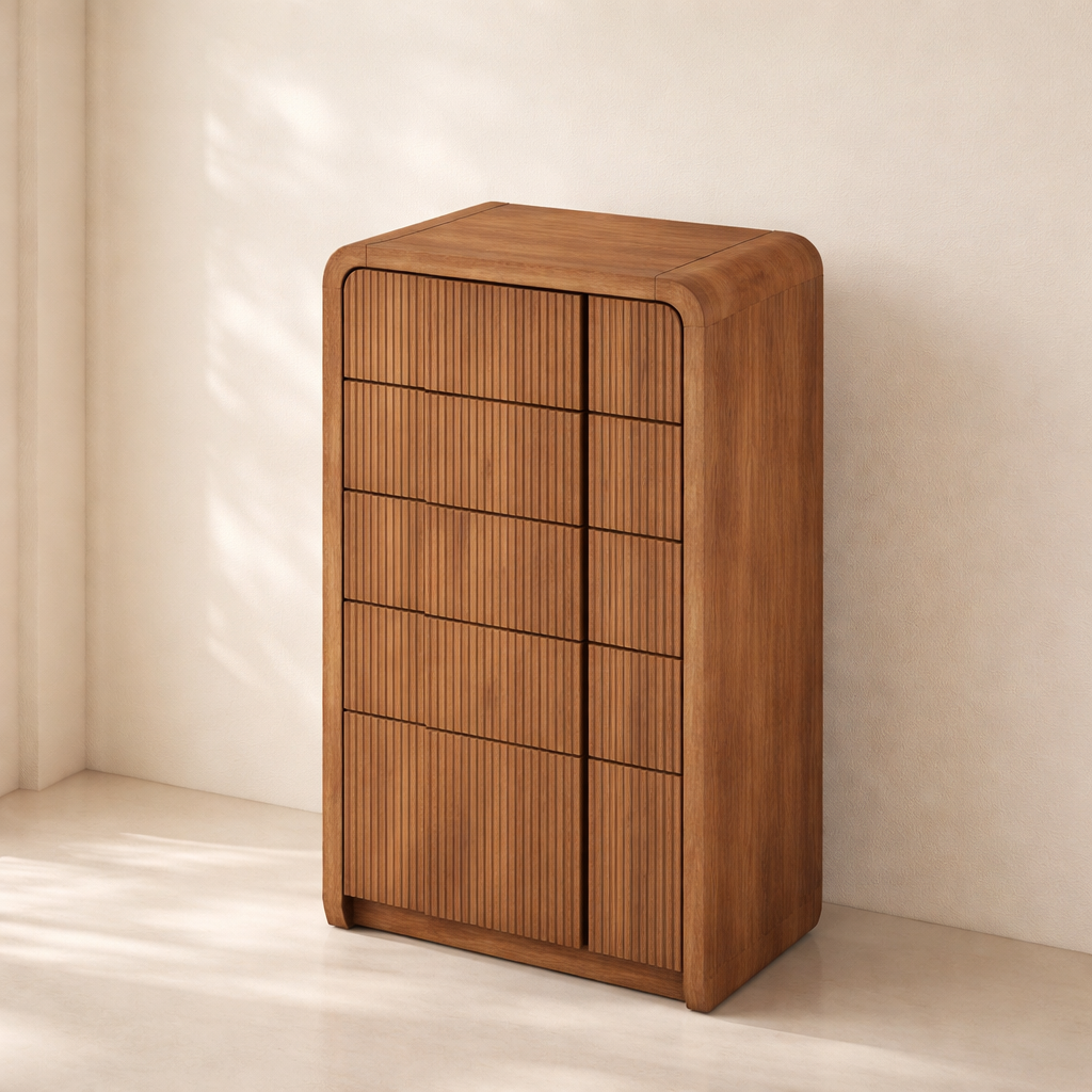 The Fluted Chest brings modern charm and sculptural beauty to your bedroom with its vertically grooved drawer fronts and gracefully arched silhouette. Crafted from solid wood with a rich natural finish, this piece blends textural detail with soft curves for a contemporary yet organic look. Its six drawers offer generous storage space while the subtle grooves add visual depth and elegance to the design. Whether styled alone or with matching pieces, it elevates your space with its unique architectural presence. Available in black, cream, brown, and natural finishes. Dimensions: 32" W x 21" D x 48" H.