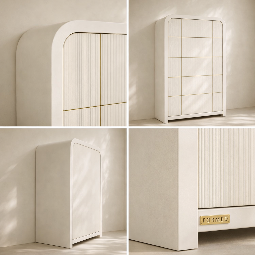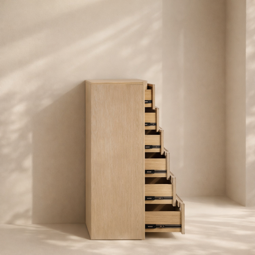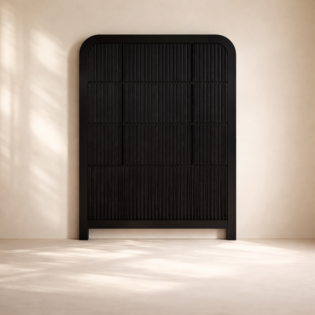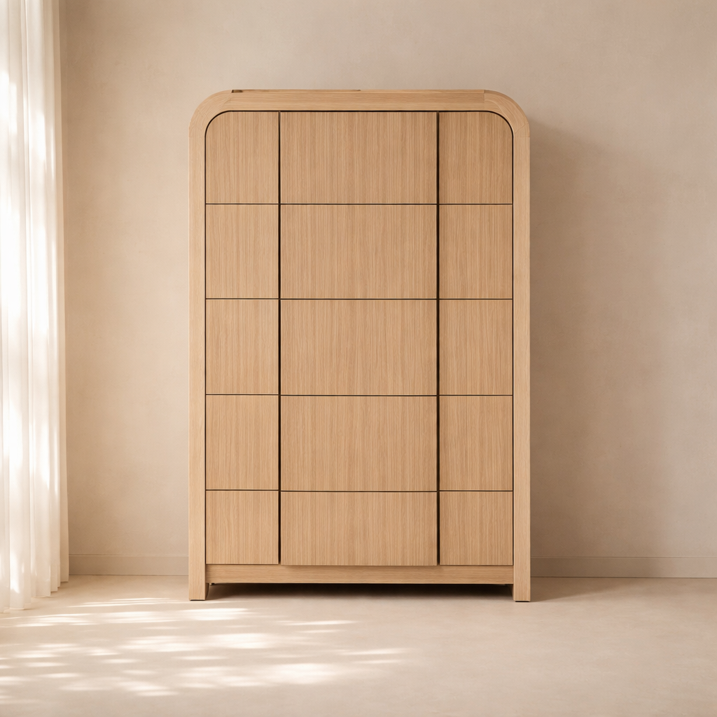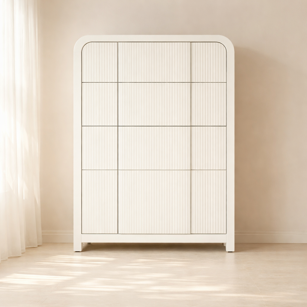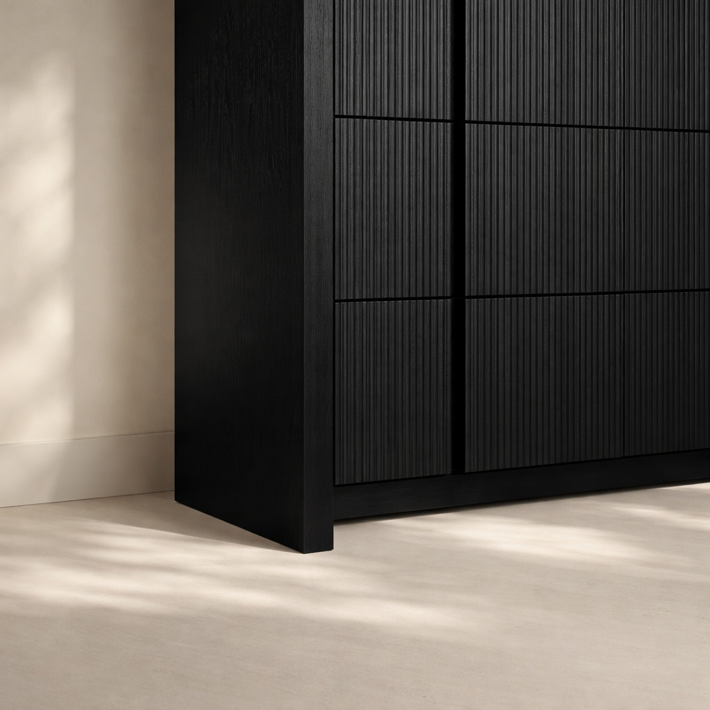The Fluted Chest brings modern charm and sculptural beauty to your bedroom with its vertically grooved drawer fronts and gracefully arched silhouette. Crafted from solid wood with a rich natural finish, this piece blends textural detail with soft curves for a contemporary yet organic look. Its six drawers offer generous storage space while the subtle grooves add visual depth and elegance to the design. Whether styled alone or with matching pieces, it elevates your space with its unique architectural presence. Available in black, cream, brown, and natural finishes. Dimensions: 32" W x 21" D x 48" H.
