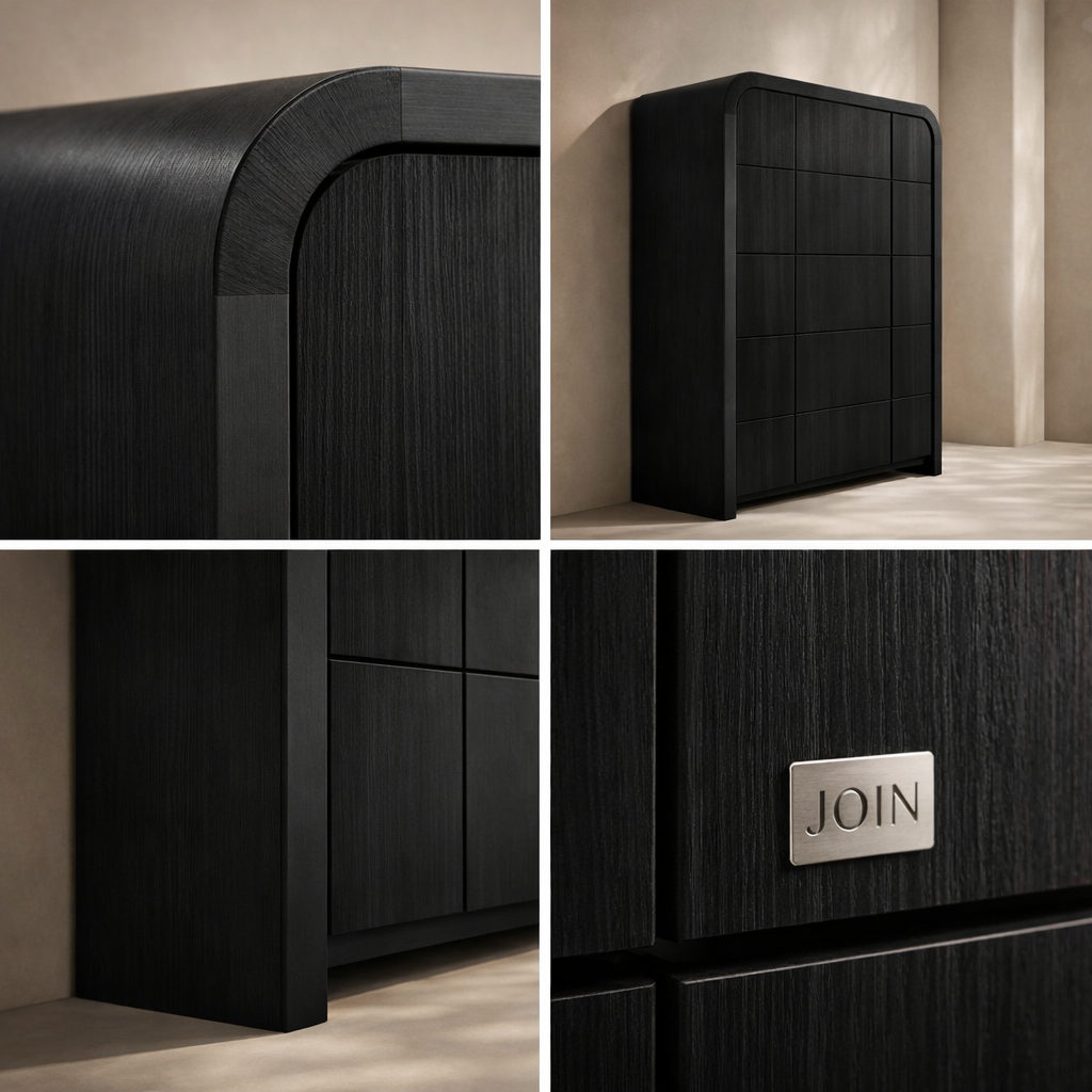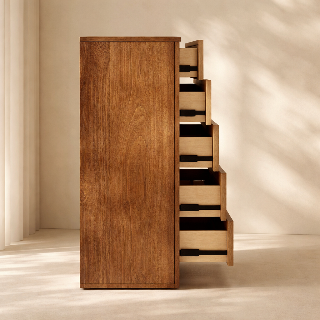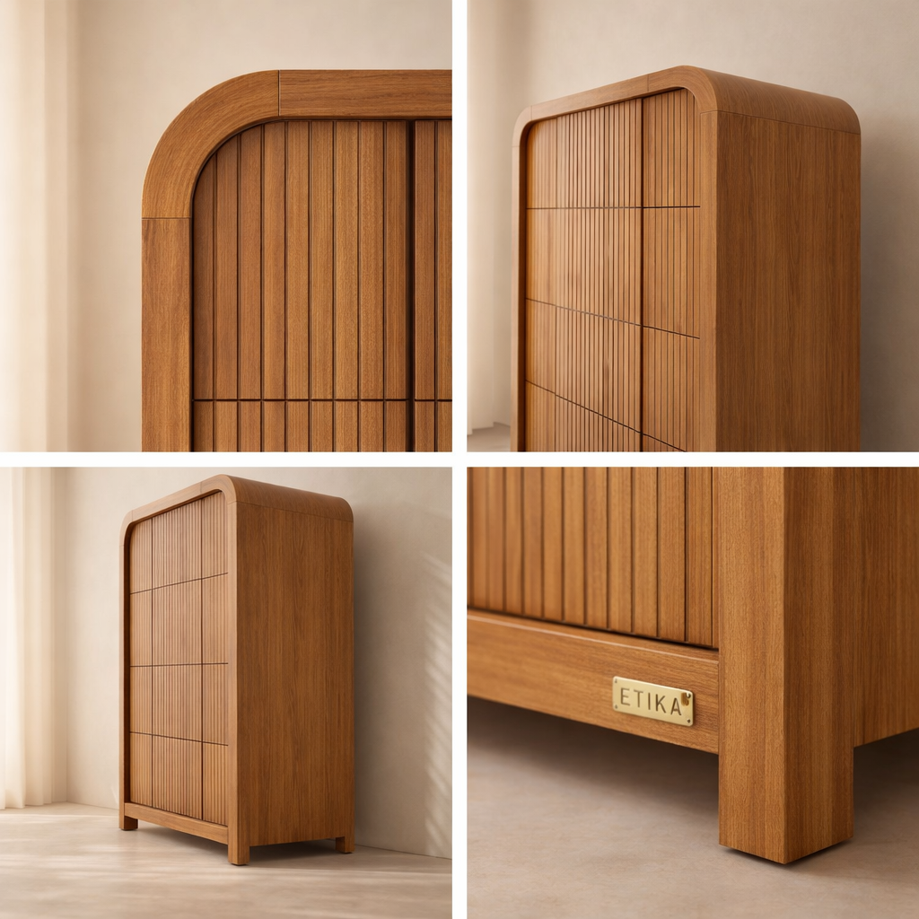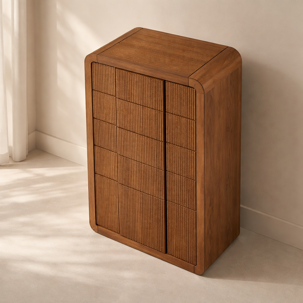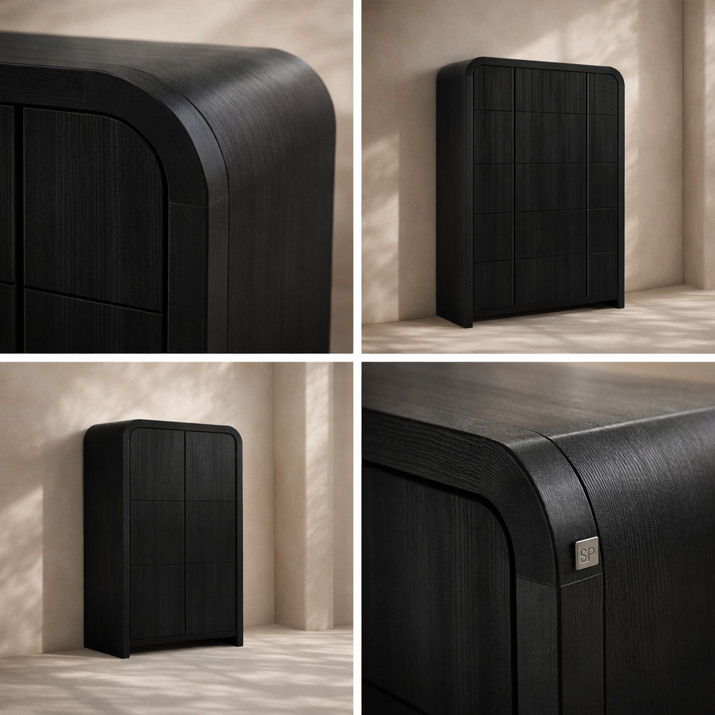 The Fluted Chest brings modern charm and sculptural beauty to your bedroom with its vertically grooved drawer fronts and gracefully arched silhouette. Crafted from solid wood with a rich natural finish, this piece blends textural detail with soft curves for a contemporary yet organic look. Its six drawers offer generous storage space while the subtle grooves add visual depth and elegance to the design. Whether styled alone or with matching pieces, it elevates your space with its unique architectural presence. Available in black, cream, brown, and natural finishes. Dimensions: 32" W x 21" D x 48" H.