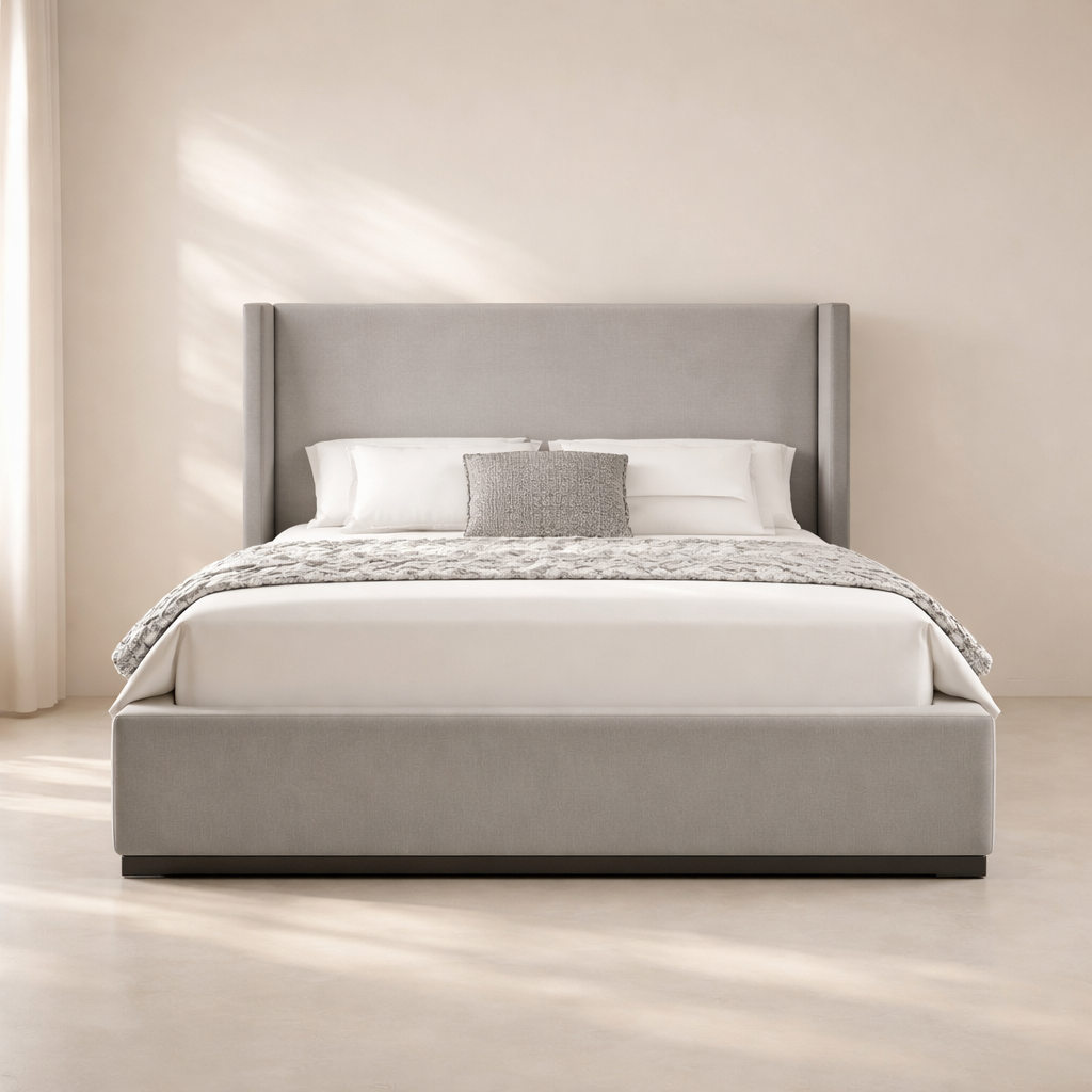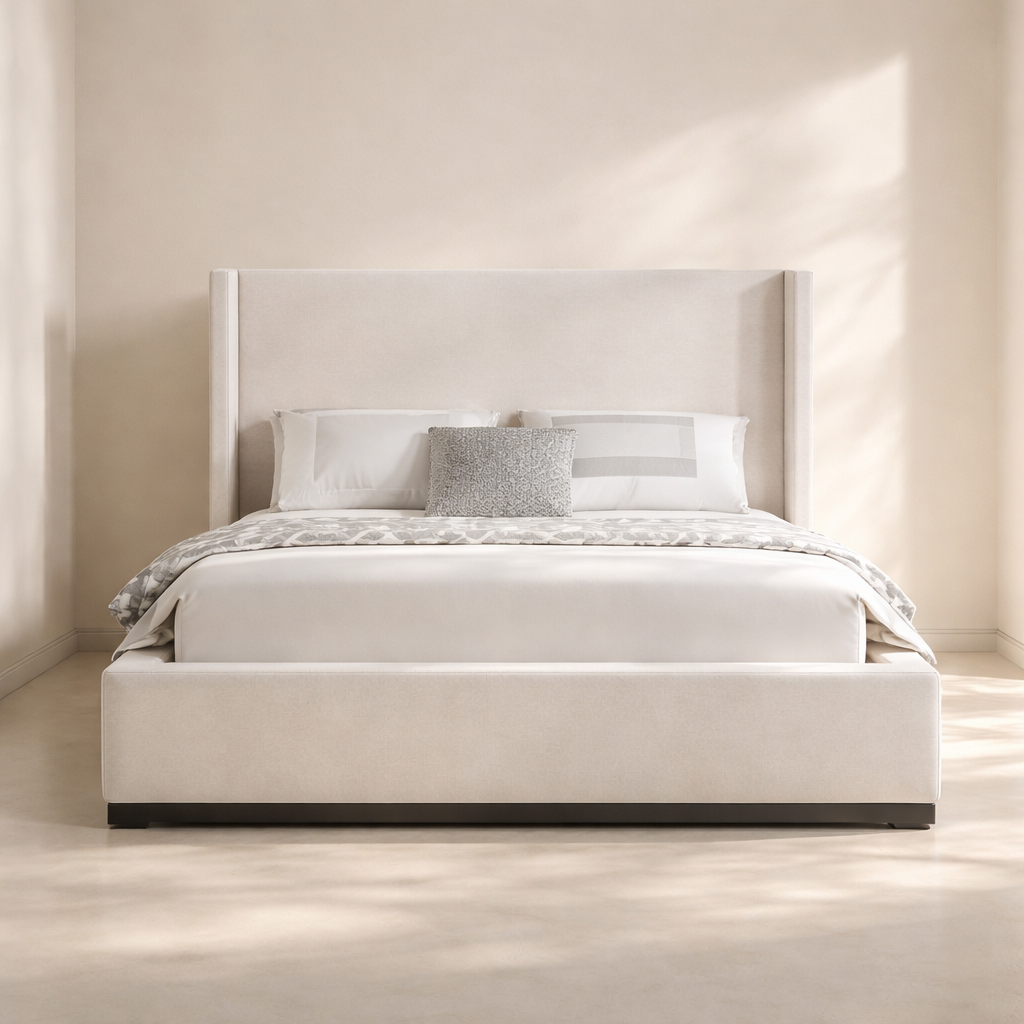 The Flynn Linen Textured Fabric Upholstered Bed is designed to bring a modern, premium look to your bedroom while offering strong everyday comfort. Upholstered in linen-textured fabric and available in multiple colour options, it features a refined wingback panel headboard supported by a durable engineered wood frame with a solid wood base, along with sturdy side rails and legs for enhanced stability. With overall dimensions of 81.5" W x 87.5" D x 52" H, this bed provides ample sleeping space and a supportive headboard height for a comfortable and relaxing sleeping experience. The sturdy slatted base ensures proper mattress support without the need for a box spring, while the clean silhouette and tailored wingback design make it a perfect fit for contemporary and upscale interiors. Customers love its solid construction, elegant headboard profile, and effortless blend of comfort and modern style.