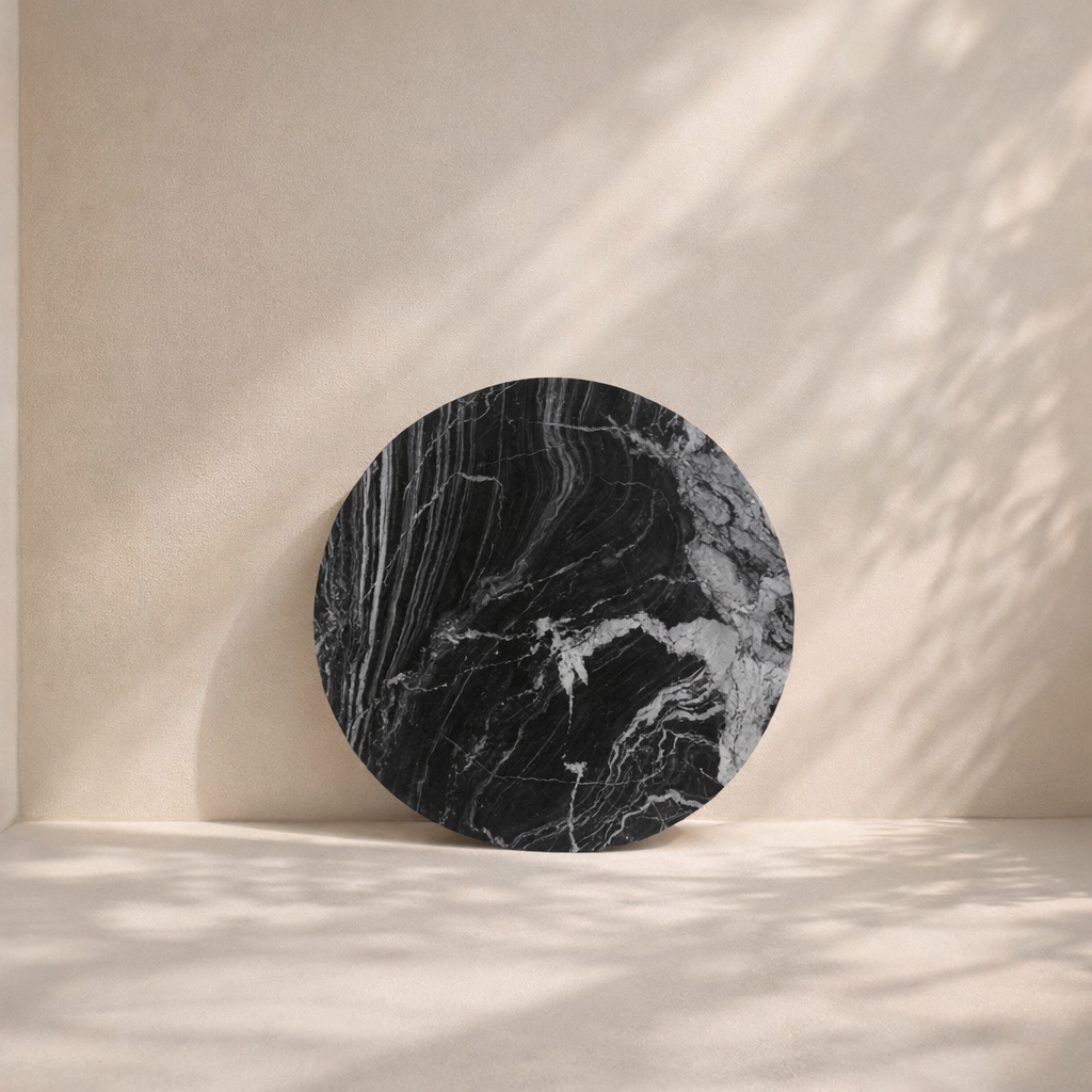 The Formentera Dining Table brings modern sophistication to your space with its striking round shape and artful base design. Made from handcrafted genuine marble, this table features bold natural veining in black, cream, or brown finishes, offering a unique and elegant focal point for your dining room. Each piece is one of a kind, emphasizing individuality and craftsmanship. Its polished marble surface exudes luxury, while the sculptural base blends functionality with artistic form. With a tabletop thickness of 0.75", this table is both visually stunning and built for long-lasting use. Dimensions: 48" W x 48" D x 30" H.