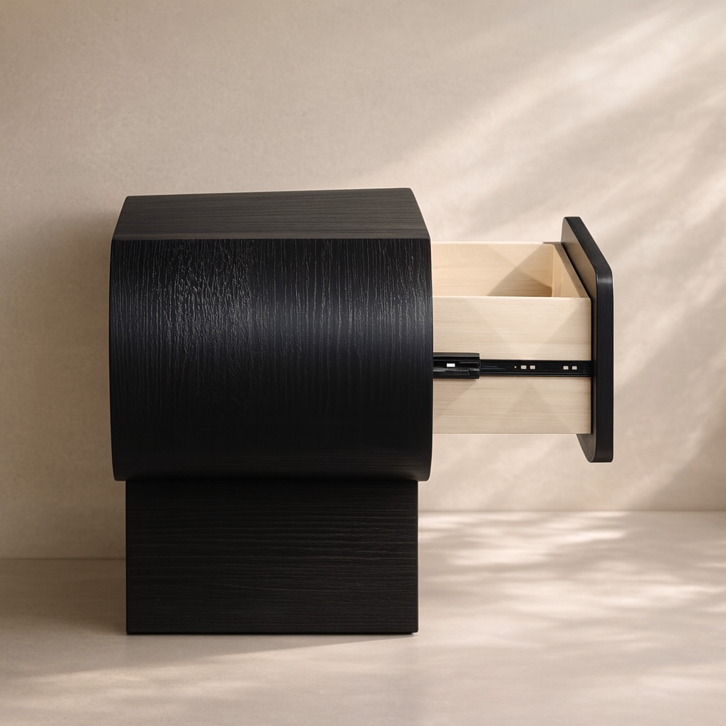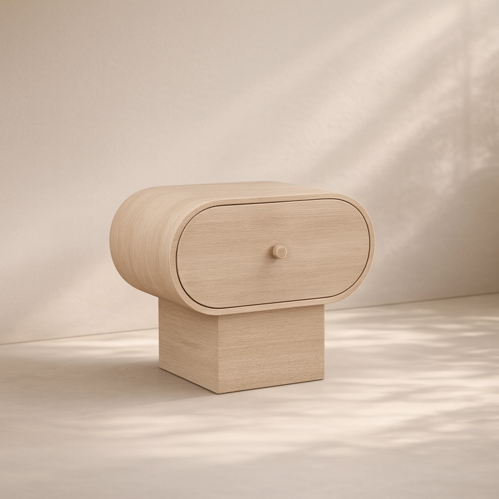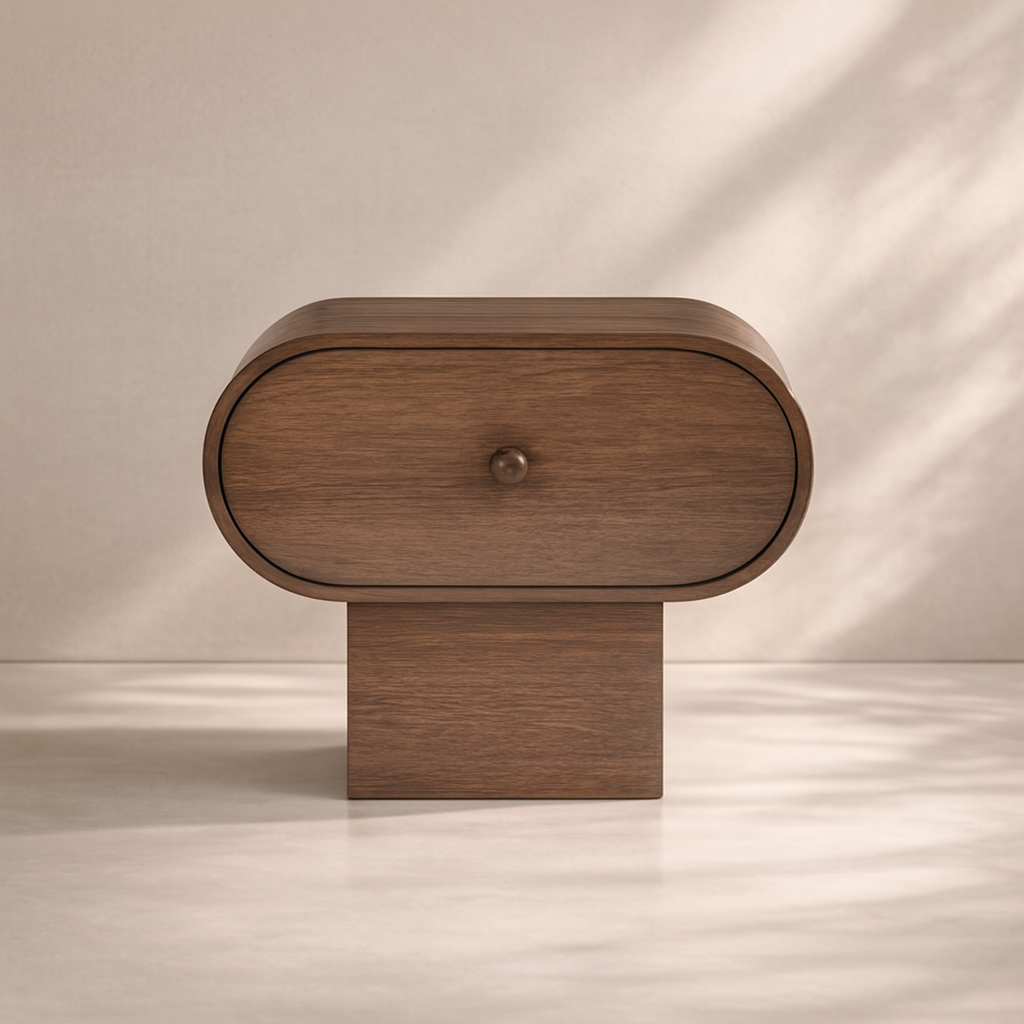 The Harlow Nightstand brings modern sophistication to your bedroom with its rich brown oak veneer finish and distinctive art deco design. Its curved edges and soft silhouette offer a warm, sculptural aesthetic that adds character to any space. Made from a mix of solid wood and MDF, this piece is as sturdy as it is stylish, featuring a raised pill-shaped frame and a concealed drawer with a rounded pull for subtle functionality. Ideal for storing nighttime essentials while enhancing your bedroom’s ambiance, this nightstand balances form and function beautifully. Available in three elegant colors: black, brown, and natural. Dimensions: 30"W x 17"D x 24"H.