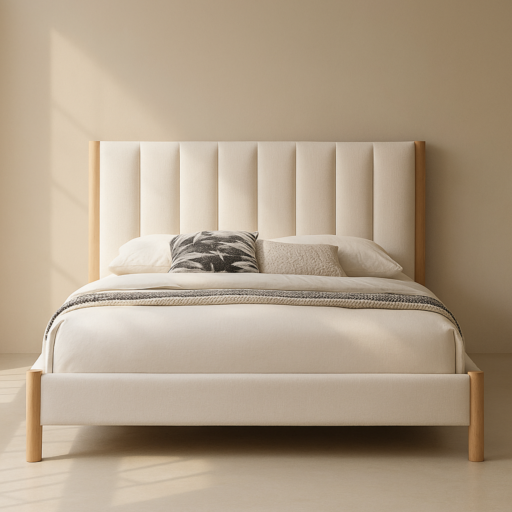 The Kona Fabric Upholstered Bed is designed to bring a modern, premium look to your bedroom while offering strong everyday comfort. Upholstered in soft polyester fabric and available in multiple colour options, it features a clean vertical channel-tufted panel headboard supported by a durable engineered wood frame with solid wood legs in a natural finish, providing enhanced stability and timeless appeal. With overall dimensions of 82.5" W x 86.5" D x 47" H, this bed offers ample sleeping space and a comfortably elevated headboard for relaxing, reading, or unwinding at the end of the day. The sturdy slatted base ensures proper mattress support without the need for a box spring, while the refined mid-century modern design makes it a perfect fit for contemporary, minimalist, and stylish interiors. Customers love its solid build, elegant vertical detailing, and effortless blend of comfort and modern design.