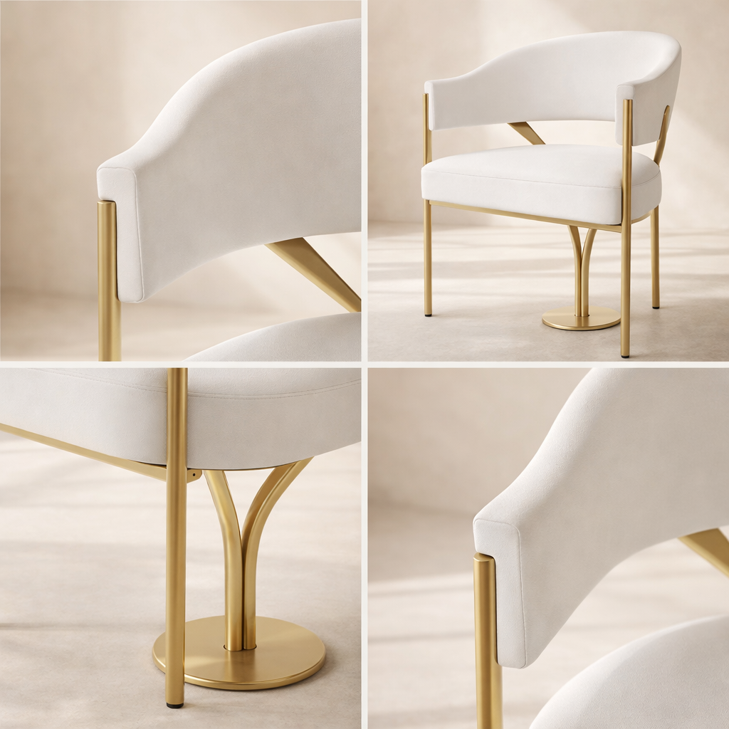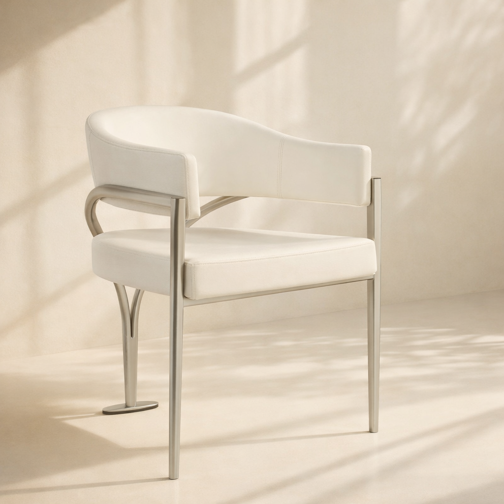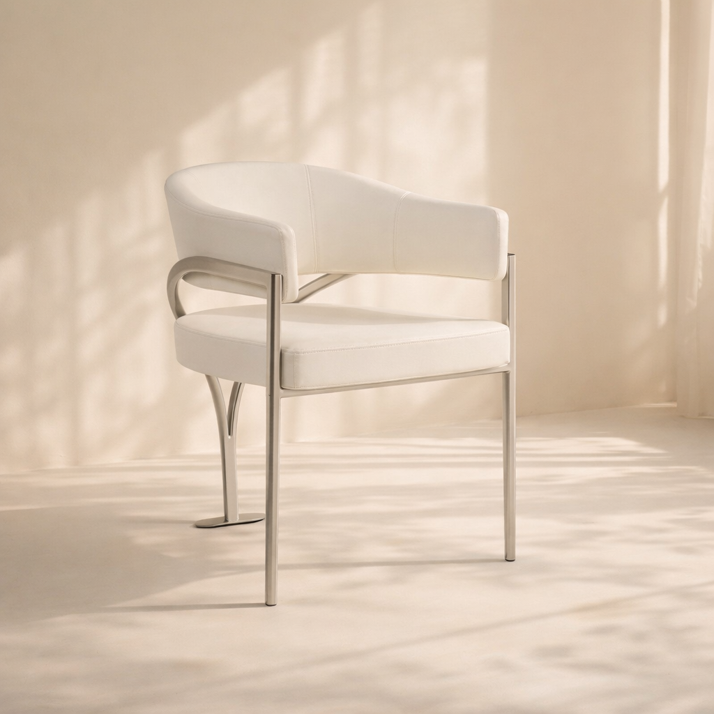 The Madelyn Vegan Leather Dining Chair brings modern elegance and luxurious comfort to your dining space with its smooth vegan leather upholstery in a creamy hue. Designed for both style and durability, the chair features a gently curved barrel back that hugs the body and padded cushioning for added support during meals. Its iron metal frame provides reliable strength while the brushed brass finish adds a refined and contemporary flair. Perfect for upscale interiors, this piece blends timeless charm with present-day appeal. Available in cream color. Dimensions: 23.5" W x 22" D x 30" H.