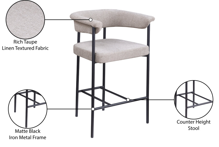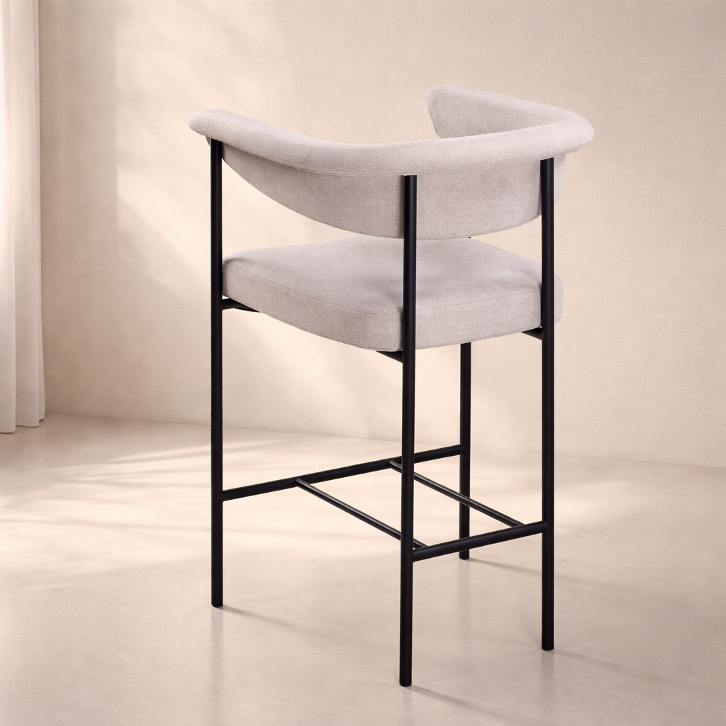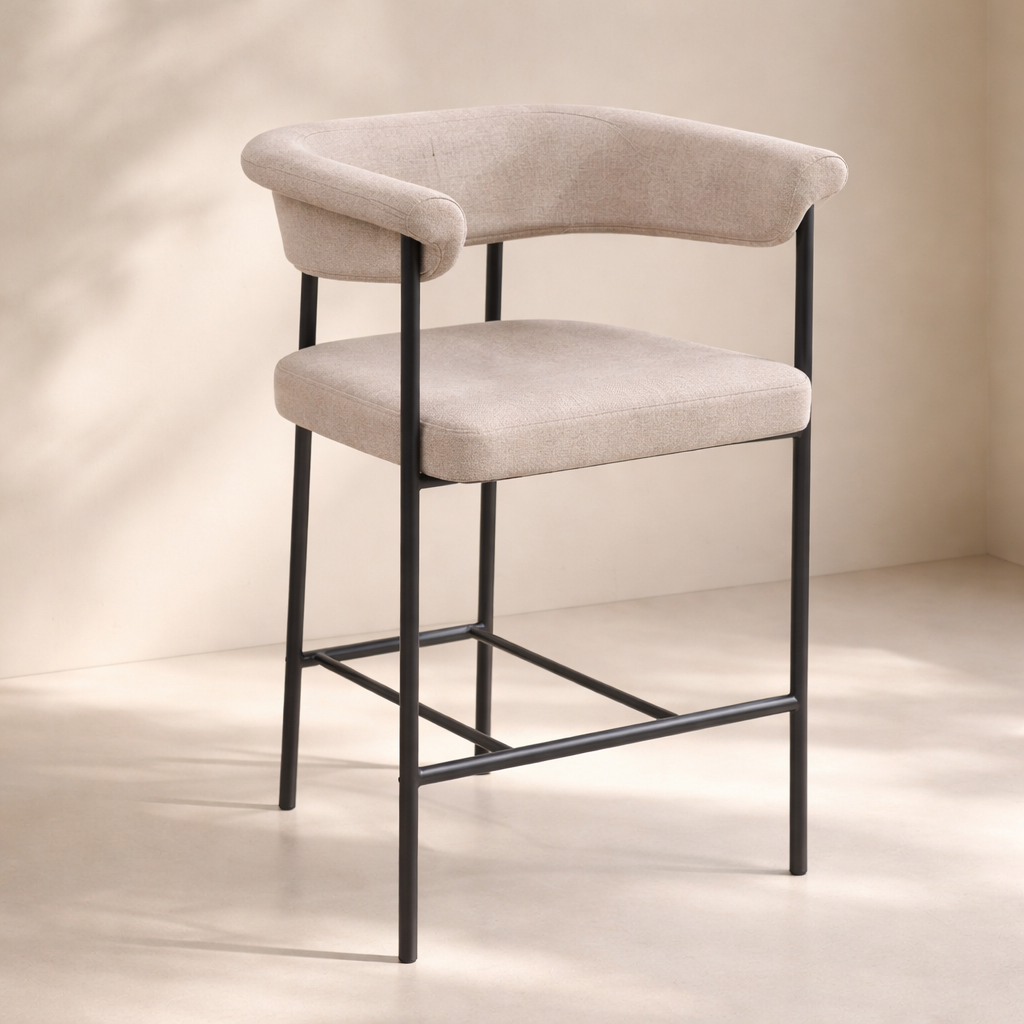 The Malin Linen Fabric Counter Stool brings modern elegance and everyday comfort to your dining space. Upholstered in soft linen-textured fabric, this chair features a gracefully curved backrest and supportive seat designed for relaxed dining experiences. The open-arm silhouette and clean lines create a contemporary look that blends effortlessly with both casual and formal settings. Sturdy matte black iron legs ensure lasting durability while complementing the minimalist aesthetic. Whether styled solo or in multiples, this chair offers a timeless upgrade to any room. Available in gray, cream, and taupe. Dimensions: 23" W x 19.5" D x 35.5" H.