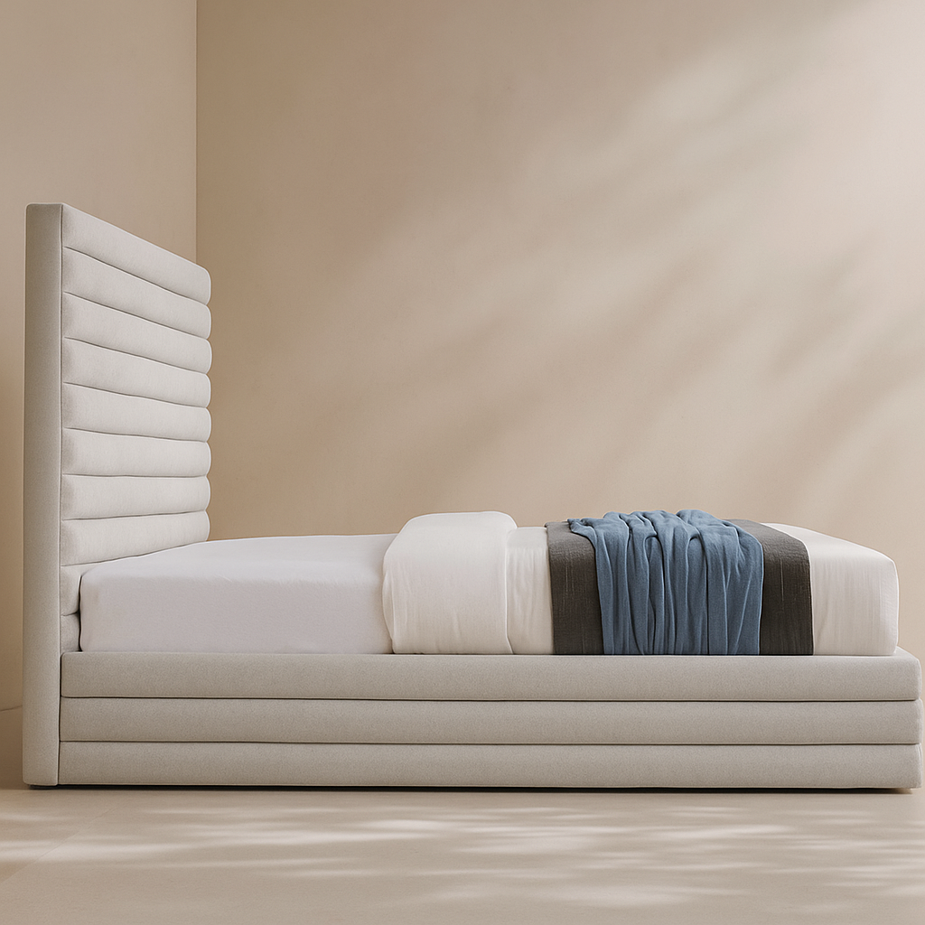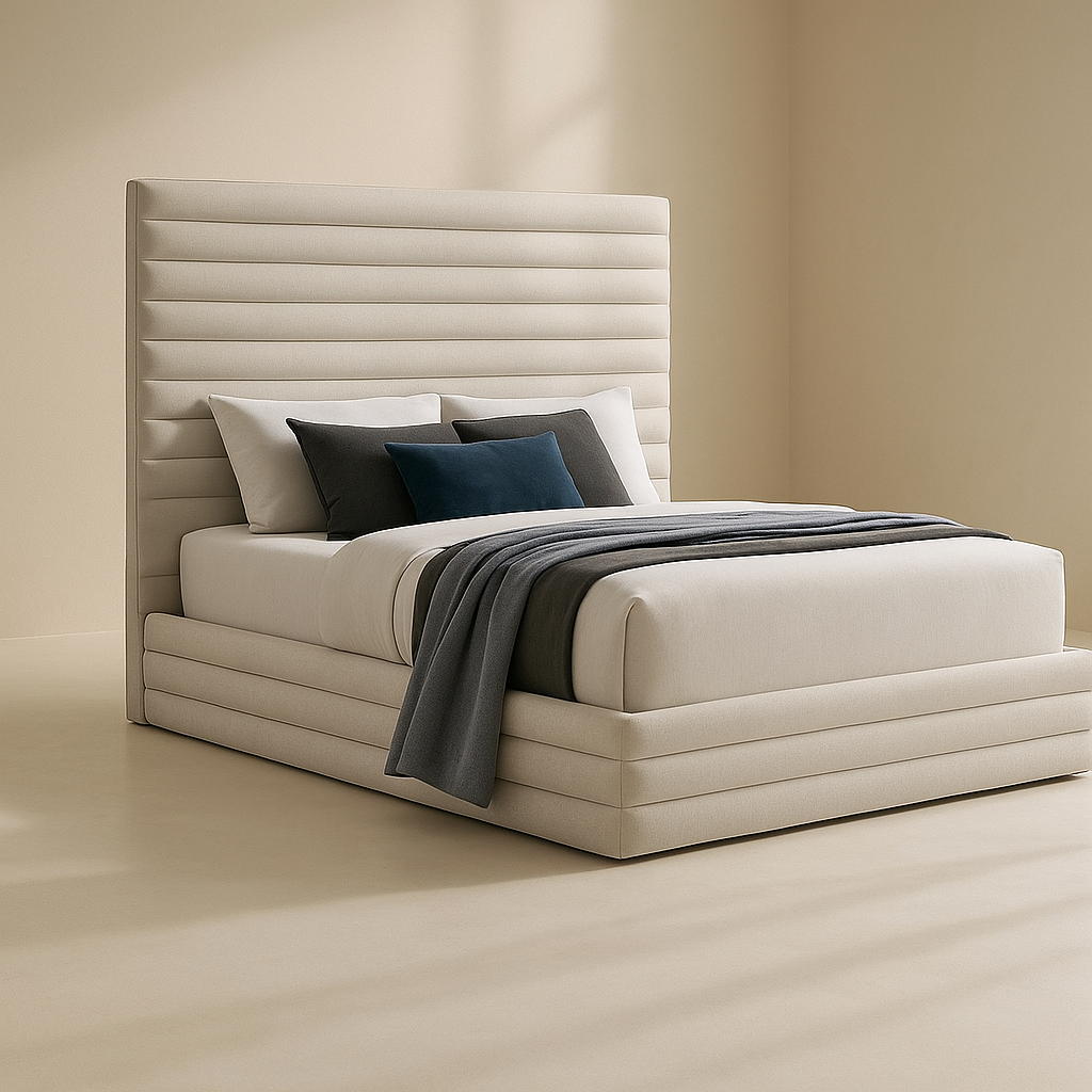 The Maxwell Linen Textured Fabric Upholstered Bed is crafted to elevate your bedroom with a refined, modern aesthetic while delivering exceptional comfort and support. Upholstered in rich linen-textured fabric and available in multiple colour options, this bed features a striking extra-tall, horizontally channeled headboard that adds depth and visual interest to any space. Built on a durable MDF and plywood frame with a fully slatted base, it eliminates the need for a box spring while ensuring long-lasting stability. With overall dimensions of 82.25" W x 87" D x 55.25" H, the Maxwell bed offers a generous sleeping area and a commanding headboard height that creates a luxurious focal point. Its clean lines, plush upholstery, and contemporary silhouette make it an ideal choice for modern, upscale, and minimalist interiors, while customers appreciate its elegant proportions, premium fabric texture, and seamless blend of style and everyday functionality.