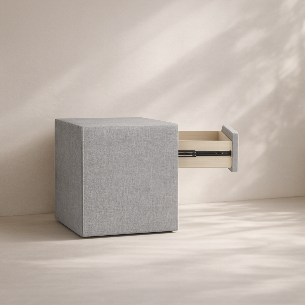The Medley Nightstand | Side Table brings modern charm and soft sophistication to your space with its clean-lined silhouette and luxe cream linen texture. Wrapped in a fabric that adds warmth and elegance, it features a unique matte black squiggle handle for a bold and artistic statement. A spacious lower shelf offers room for books or display, while the soft-close drawer keeps nighttime essentials neatly tucked away. Its smooth curved corners add a refined, sculptural feel, making it a standout in any bedroom or living area. This versatile piece effortlessly combines design and practicality for both styling and storage. Available in cream and gray color options. Dimensions: 22"W x 17"D x 24.5"H.