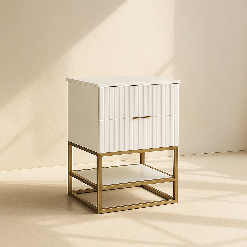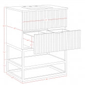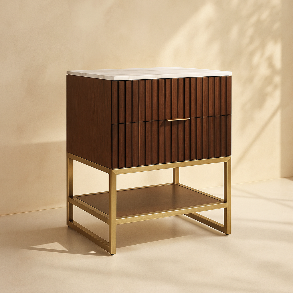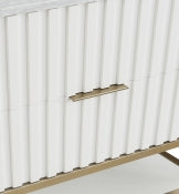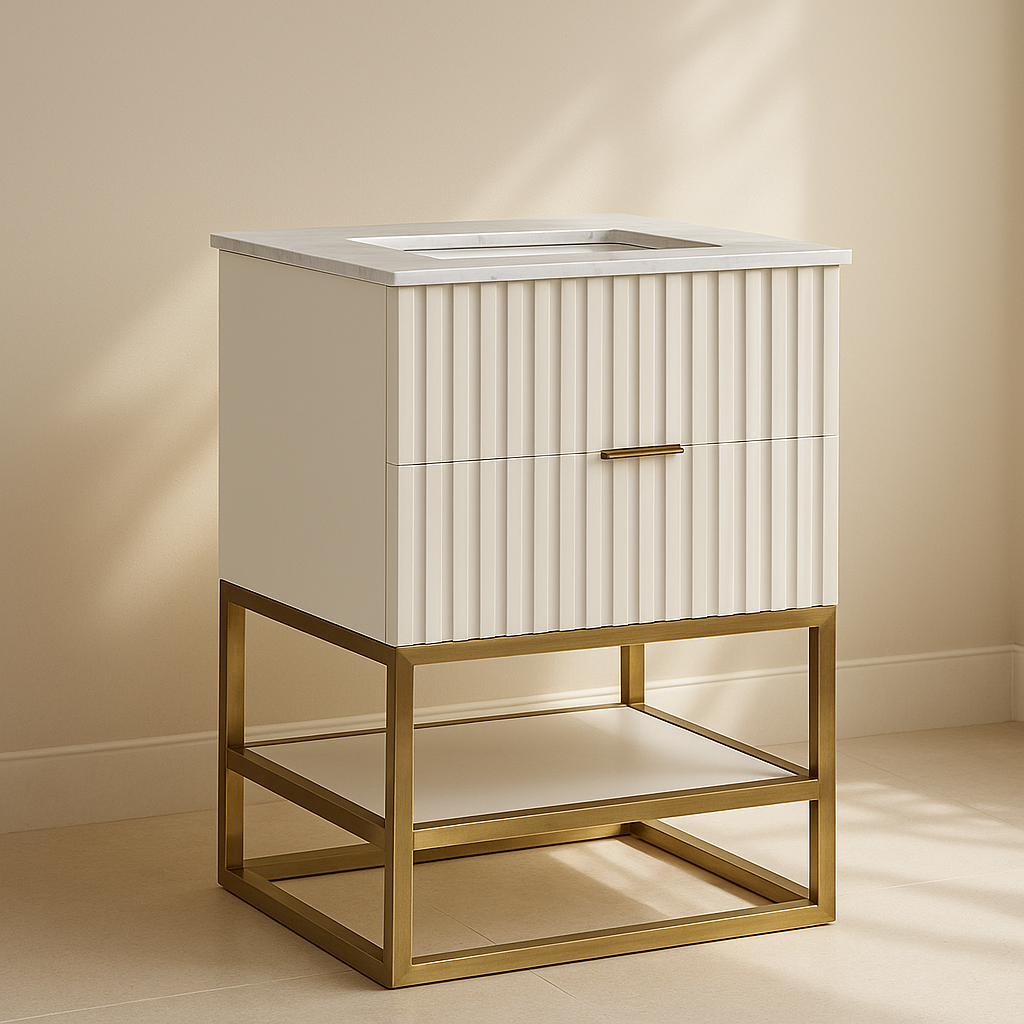 The Monad 24" Bathroom Vanity brings modern sophistication to any bath space, blending functionality with sleek aesthetics. Featuring a rich walnut or crisp white finish over birch wood veneer, it adds natural warmth and texture to your space. The vertical slatted design offers eye-catching detail, while brushed gold stainless steel framing provides sturdy support and visual contrast. A genuine marble top with an integrated ceramic sink adds luxury and practicality. The soft-close drawer and open lower shelf offer smart storage options without compromising style. Available in White and Walnut finishes. Dimensions: 24"W x 20"D x 34.5"H.