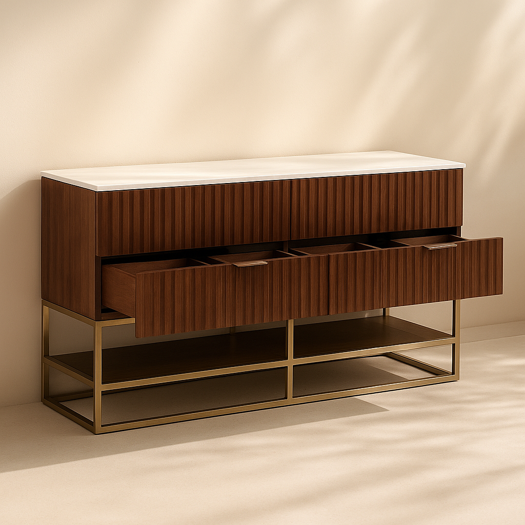 The Monad 60" Bathroom Vanity brings modern sophistication to any bath space, blending functionality with sleek aesthetics. Featuring a rich walnut or crisp white finish over birch wood veneer, it adds natural warmth and texture to your space. The vertical slatted design offers eye-catching detail, while brushed gold stainless steel framing provides sturdy support and visual contrast. A genuine marble top with an integrated ceramic sink adds luxury and practicality. The soft-close drawer and open lower shelf offer smart storage options without compromising style. Available in White and Walnut finishes. Dimensions: 60"W x 20"D x 34.5"H.