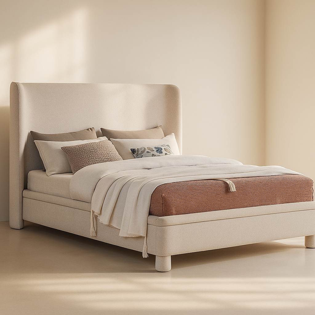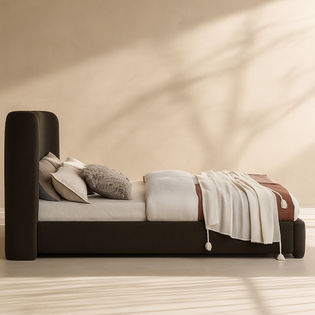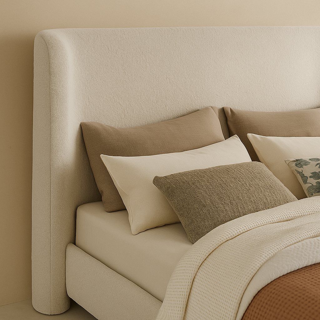 The Penny Boucle Fabric Upholstered Bed is designed to bring a soft, inviting presence to your bedroom while offering reliable comfort and modern support. Upholstered in plush boucle fabric and available in multiple colour options, this bed features a gently curved headboard that adds a refined, sculptural touch and enhances back support when relaxing in bed. Built on a sturdy engineered wood and plywood frame with a fully slatted base, it provides excellent mattress support without the need for a box spring. With overall dimensions of 87" W x 88" D x 52" H, the Penny bed delivers a generously sized sleeping area paired with a balanced, contemporary profile. Its cozy fabric texture, smooth curves, and solid construction make it a standout choice for modern interiors, while customers appreciate its comfortable feel, stable build, and effortless blend of style, comfort, and everyday functionality.