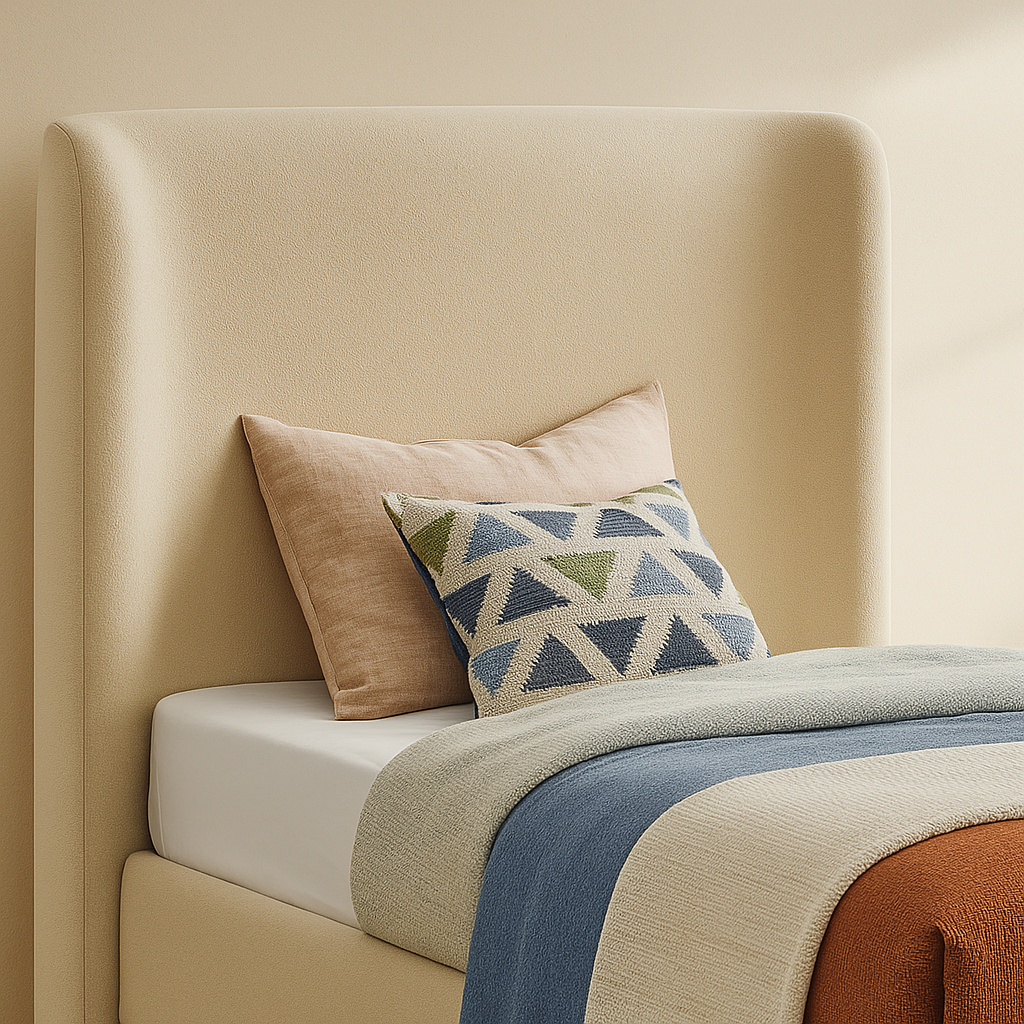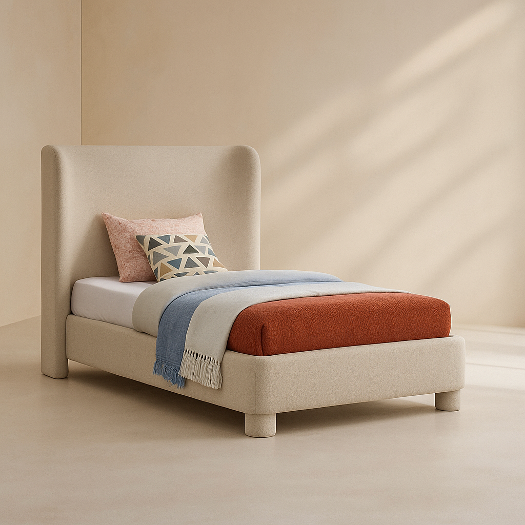 The Penny Linen Textured Fabric Upholstered Bed is designed to elevate your bedroom with a refined, modern aesthetic while providing dependable everyday comfort. Upholstered in premium linen-textured fabric and available in multiple colour options, this bed features a softly curved headboard that adds elegance and supportive comfort, making it ideal for relaxing in bed. Built on a durable engineered wood and plywood frame with a fully slatted base, it delivers strong mattress support without the need for a box spring. With overall dimensions of 87" W x 88" D x 52" H, the Penny bed offers a generously sized sleeping area paired with a balanced, contemporary profile. Its smooth fabric texture, gentle curves, and solid construction make it a versatile choice for modern interiors, while customers appreciate its sturdy build, comfortable support, and seamless blend of style, comfort, and everyday functionality.