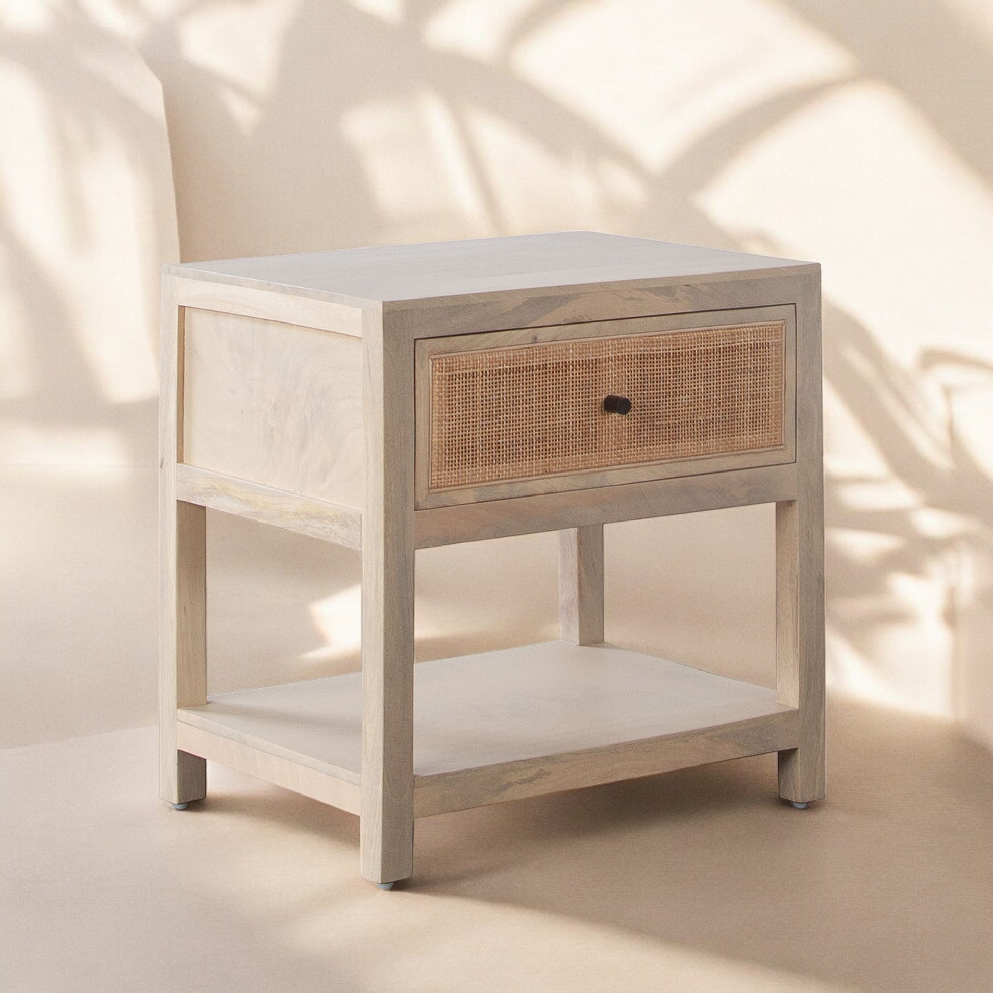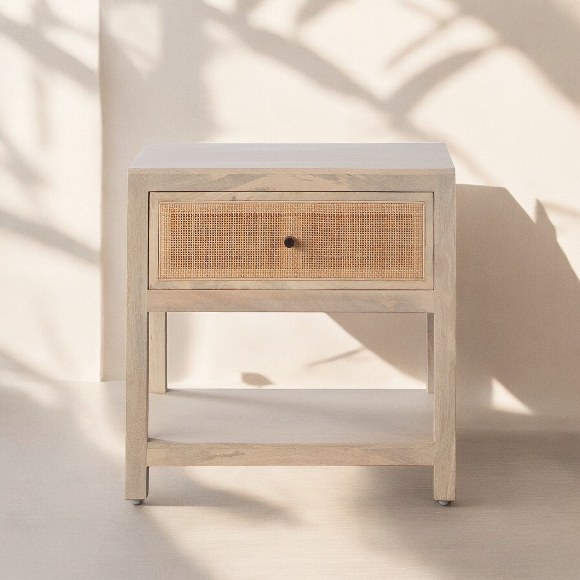 The Sadler Nightstand brings natural charm and breezy texture to the bedroom with its cane-front drawer and open lower shelf. Finished in a warm natural tone, it offers a perfect blend of relaxed style and everyday function. Fully assembled and thoughtfully designed, it makes a stylish bedside companion for modern or coastal-inspired interiors. The nightstand measures 24 x 18 x 24 inches.
