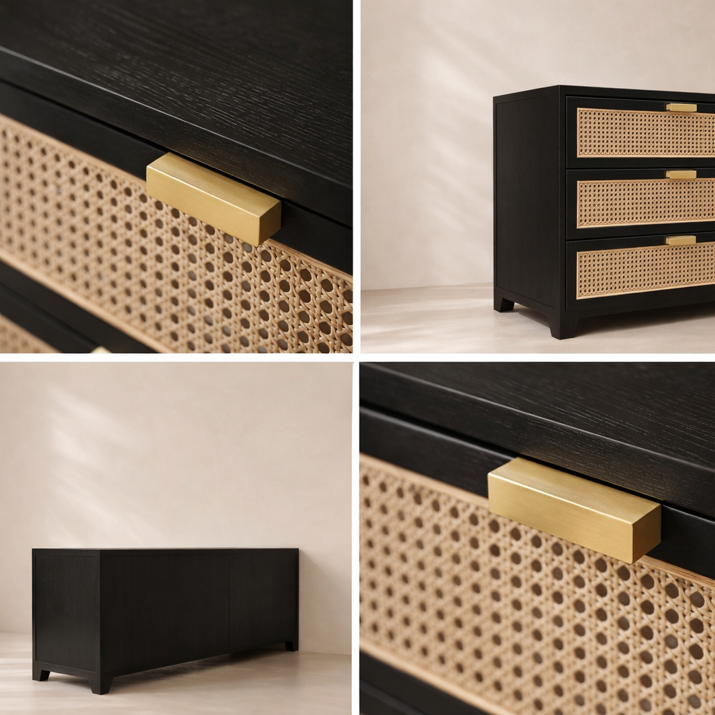 The Sage Dresser brings modern texture and versatile elegance to your bedroom with its rich wood frame and natural cane drawer fronts. This beautiful piece blends up-to-date styling with a warm organic feel, offering a refined black or white finish that easily complements both bold and neutral interiors. It includes two sets of sleek gold and chrome handles, giving you the freedom to customize your dresser’s final look. The six spacious drawers provide ample room for essentials while maintaining a compact footprint. Built to last with durable materials, this dresser is designed for effortless style and everyday convenience. Available in black and white. Dimensions: 60" W x 18" D x 30" H.