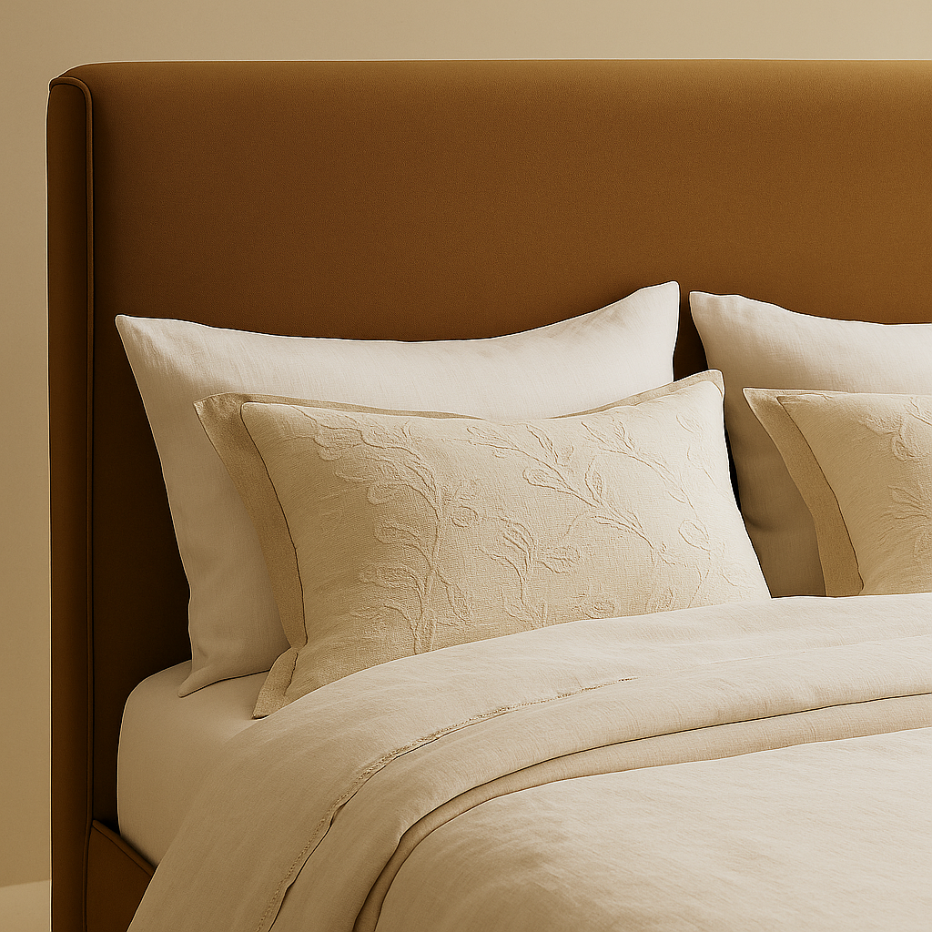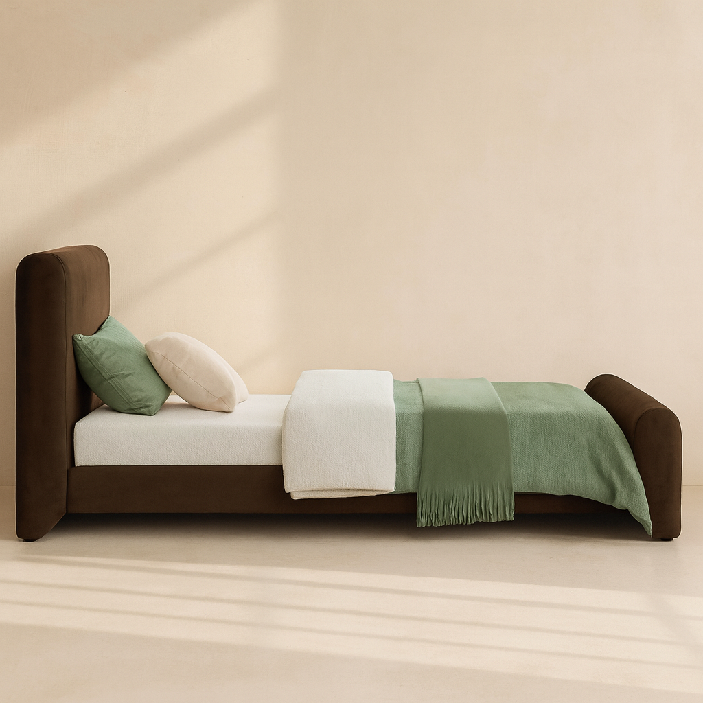 The Sloan Velvet Upholstered Bed brings refined comfort and contemporary elegance to your bedroom with its inviting silhouette and plush velvet upholstery. Wrapped in rich camel velvet, this bed offers a soft, luxurious feel while adding warmth and sophistication to modern interiors. The gently curved headboard and matching footboard create a cohesive, sculpted look that enhances visual depth and provides comfortable support for relaxing or reading. Crafted with a sturdy engineered wood frame and a fully slatted base, the Sloan bed provides dependable mattress support without the need for a box spring. Measuring 82" W x 96" D x 45" H, this king-size bed offers a generous sleeping area while maintaining a clean, balanced profile. With its smooth upholstery, sculpted form, and contemporary lines, the Sloan bed is a stylish and functional centrepiece for a polished bedroom retreat.
