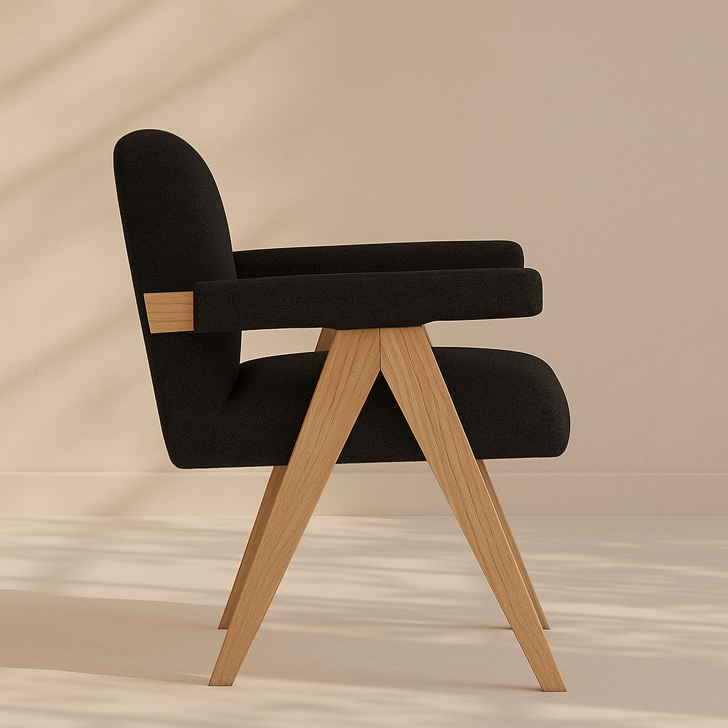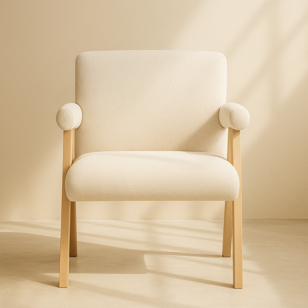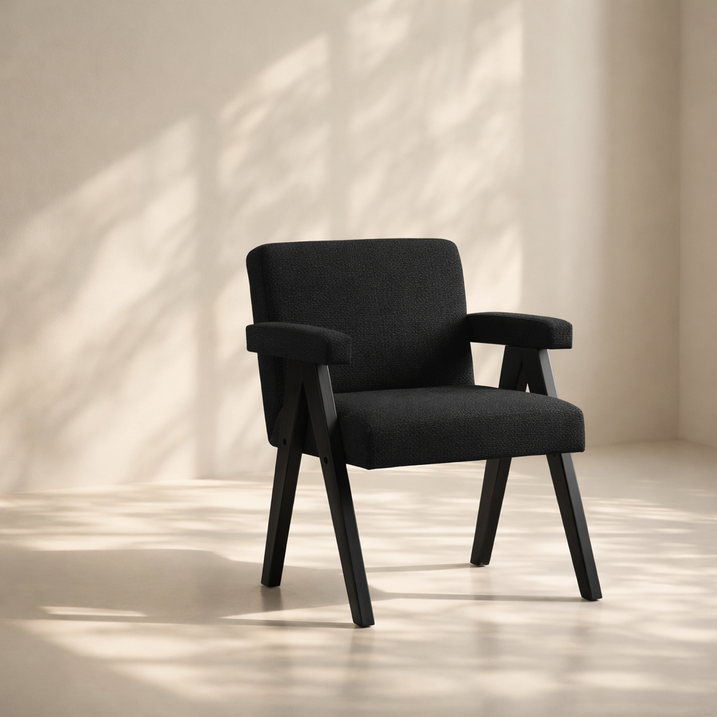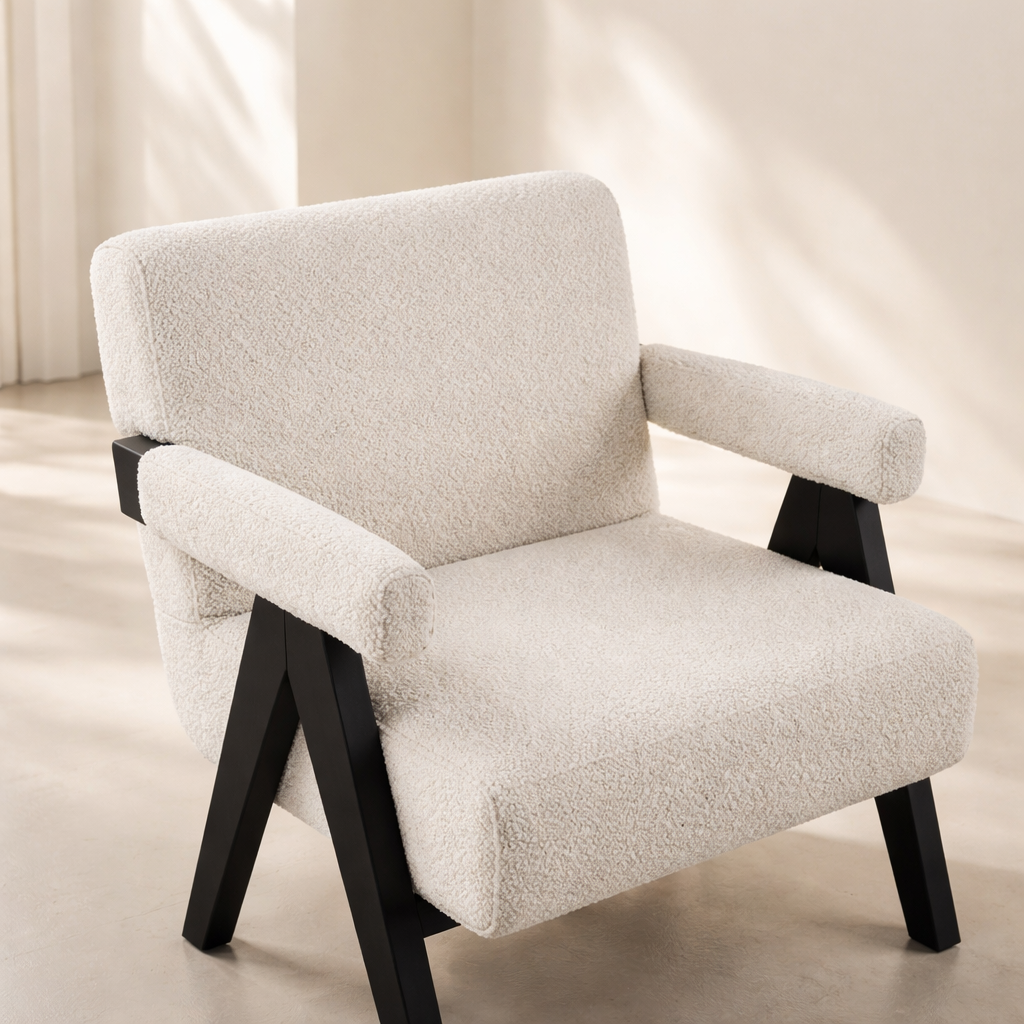 The Woodloch Accent Chair brings modern warmth and support to any space with its clean silhouette and tailored comfort. Upholstered in rich cream boucle fabric, it features a padded seat, back, and arms that offer a cozy and inviting feel. The chair's blackl finish solid wood frame provides a beautiful contrast, while its sleek legs create visual interest in an instant. Whether used as a dining accent or living room addition, it complements a range of interiors from minimalist to transitional. Available in black, cream, and green. Dimensions: 24.5" W x 23.5" D x 32" H.
