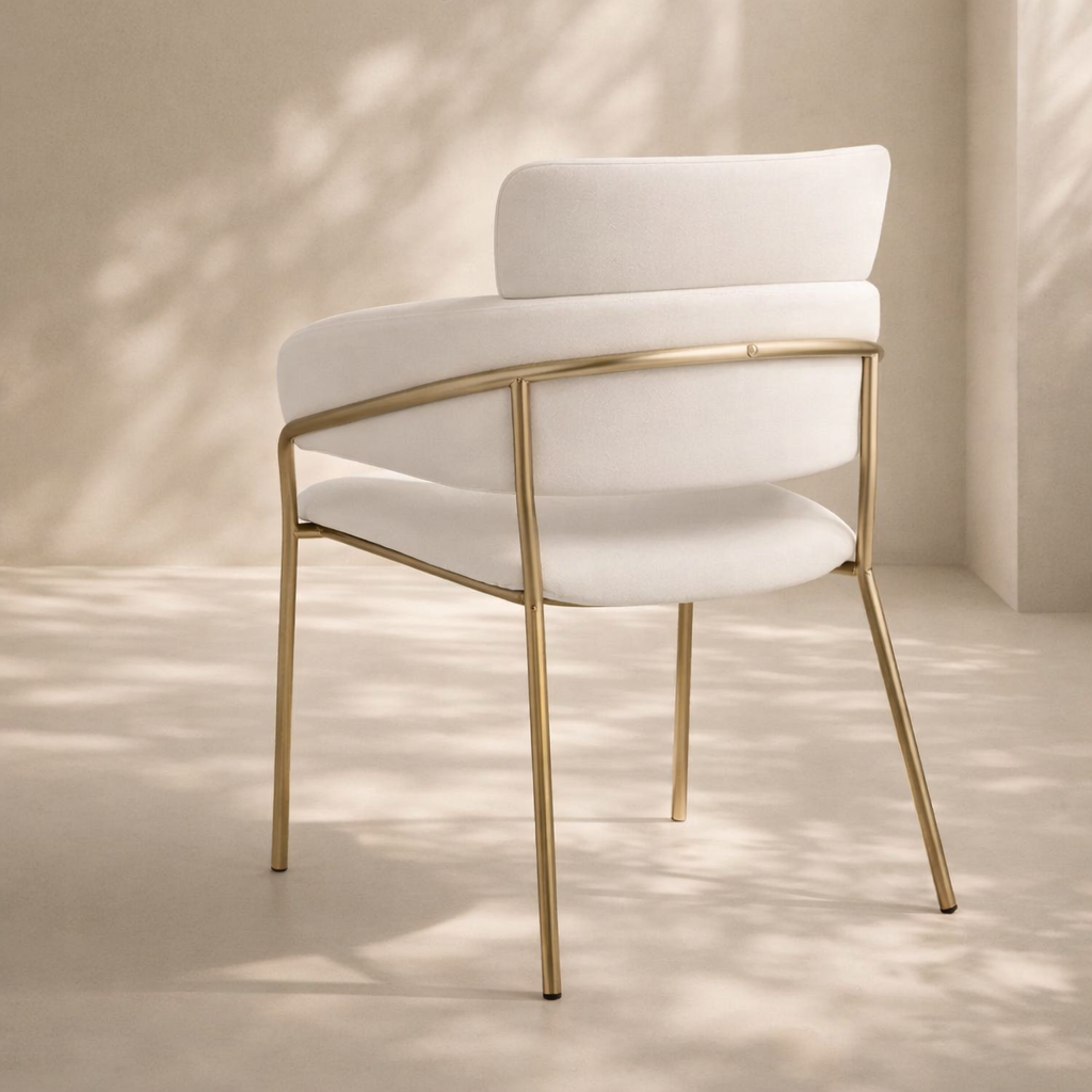 The Yara Vegan Leather Dining Chair brings modern elegance to your dining space with its soft cream vegan leather upholstery and gracefully curved silhouette. Designed for both beauty and comfort, this chair features a supportive padded back and seat, offering all-day dining ease. The sleek iron frame, finished in brushed brass, adds a glamorous edge while ensuring long-lasting durability. Whether styled solo or in a set, it brings a fresh and refined presence to any contemporary interior. The open back and slender legs enhance its airy, architectural appeal. This chair is perfect for both casual meals and formal gatherings. Available in cream. Dimensions: 22.5" W x 25.5" D x 34.5" H.