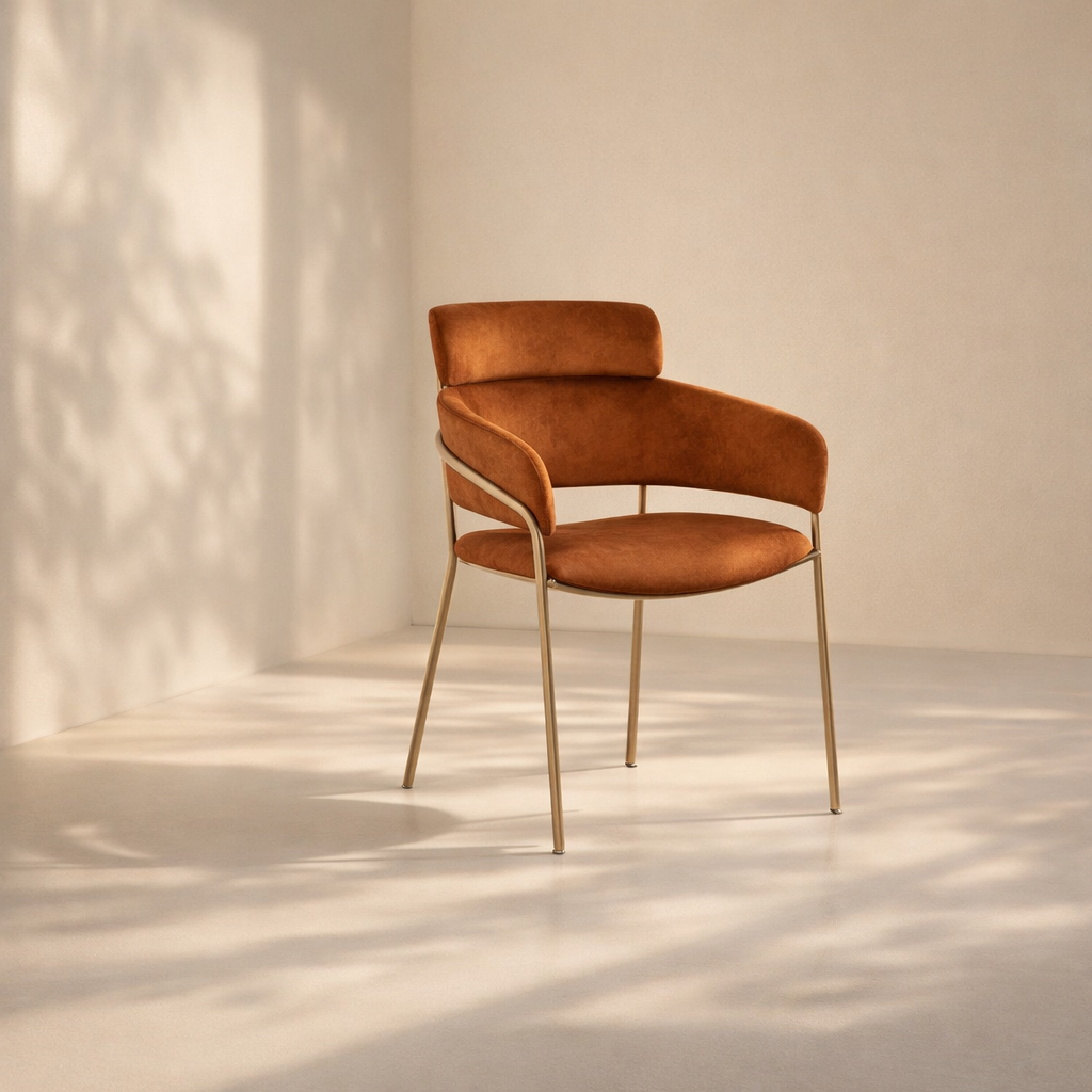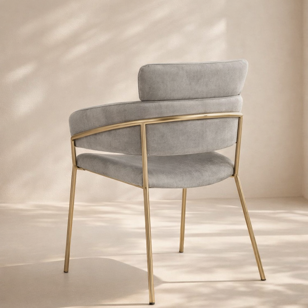 The Yara Velvet Dining Chair brings modern comfort and luxury to your dining space with its plush, cognac velvet upholstery and refined silhouette. Featuring a gently curved back and wide, padded seat, this chair is designed for long, cozy meals and stylish gatherings. The brushed brass metal frame paired with sleek iron accents enhances its contemporary appeal while offering durability and strength. Its armless profile allows for easy movement and space-saving versatility, making it ideal for both compact and spacious interiors. The rich upholstery brings warmth to any room, while the elevated design ensures a polished aesthetic. Available in black, gray, green, cognac, stone, and beige to suit every setting. Dimensions: 22.5" W x 25.5" D x 34.5" H.